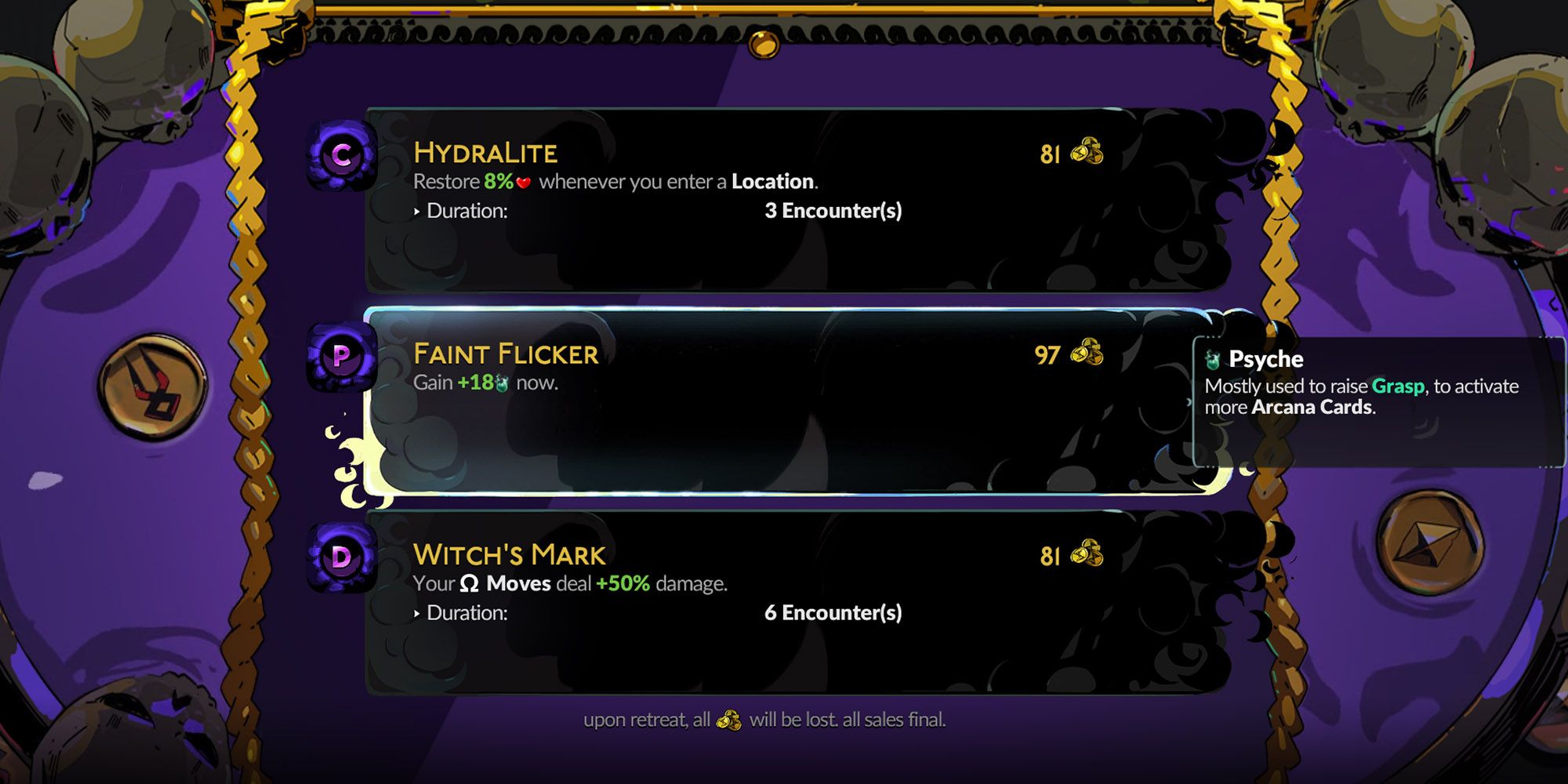Как и в случае с Пеплом, вы сможете купить Психику в магазинах Харона, если он предложит это. Обычно это будет стоить около 50 золотых. |