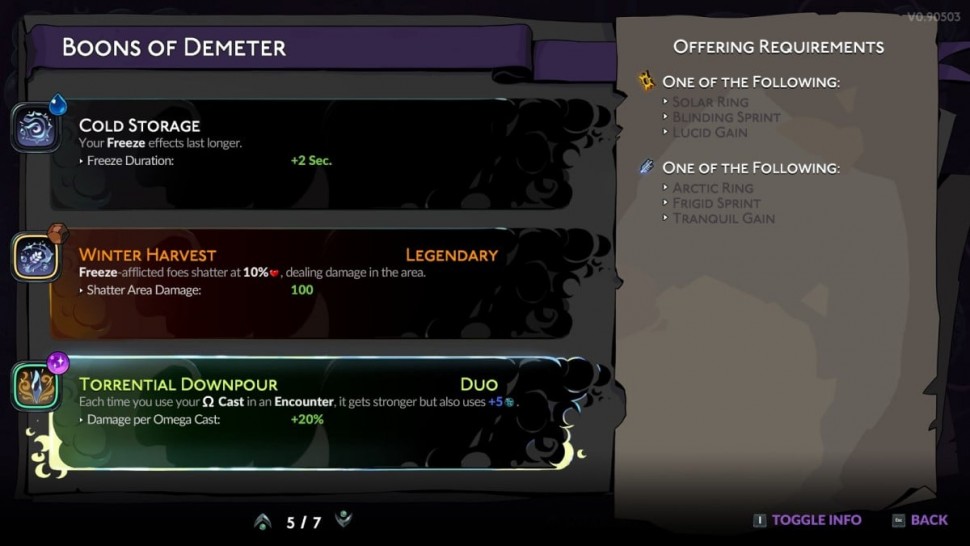 Морозный ожог - мощный комбо-инструмент. Для билдов, способных наносить цели большое количество ожогов, таких как Sister Blade Special или Witch's Staff Attack, это может добавить противнику тысячи единиц урона от ожогов. Заморозка имеет кулдаун 10 секунд, но без помощи другого дуо-дарами не проходит, поэтому выбирайте время для атаки с усилением Деметры с умом, чтобы получить максимальную пользу. Синергия с опаляющими заклинаниями очень важна для получения больших показателей, но если вы хотите получить максимальную пользу, избегайте Огнетушителя Гестии.