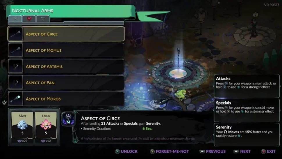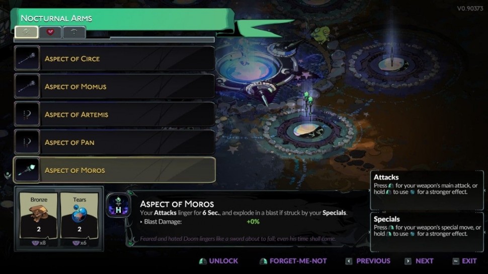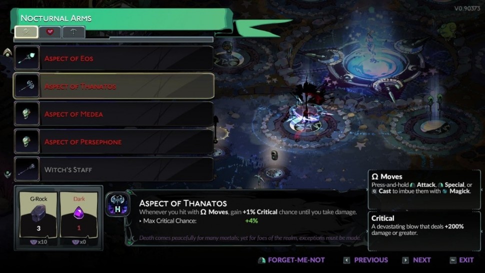 Чтобы увидеть Аспекты Оружия, вы должны сначала пройти Инкантацию Аспектов Ночи и Тьмы в Hades 2. Это заклинание не разблокируется по умолчанию, а становится доступным, когда Геката сочтет вас достойным его после нескольких прохождений. Это может занять некоторое время, в зависимости от вашей удачи и того, какие заклинания она уже дала вам. Получив его, вы сможете разблокировать Аспекты оружия за пять бронзовых и один найтшейд.