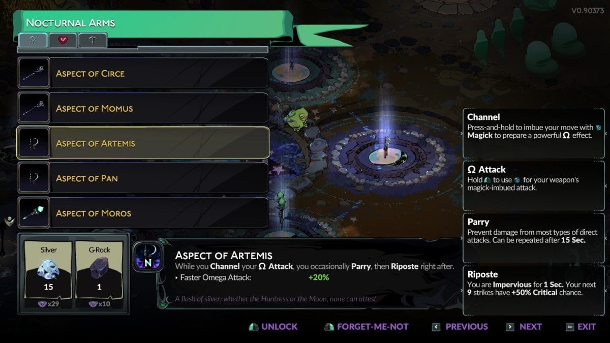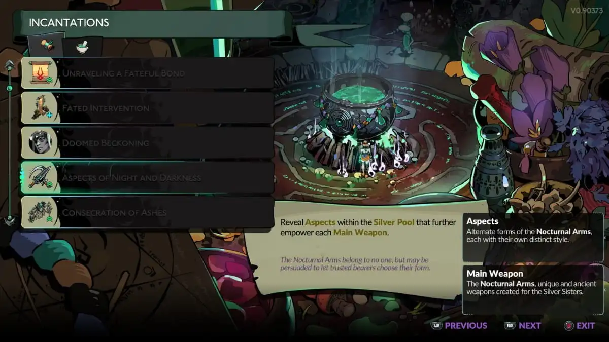 Чтобы увидеть Аспекты Оружия, вы должны сначала пройти Инкантацию Аспектов Ночи и Тьмы в Hades 2. Это заклинание не разблокируется по умолчанию, а становится доступным, когда Геката сочтет вас достойным его после нескольких прохождений. Это может занять некоторое время, в зависимости от вашей удачи и того, какие заклинания она уже дала вам. Получив его, вы сможете разблокировать Аспекты оружия за пять бронзовых и один найтшейд.