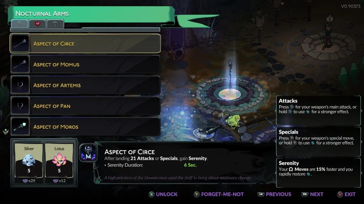 Разблокировав это заклинание, отправляйтесь в Серебряный бассейн, где вы выбираете и разблокируете свое Ночное оружие. Коснитесь центра бассейна, чтобы открыть меню разблокировки оружия. На вкладке справа вы можете улучшить уже имеющееся оружие, включая базовые варианты Мелиноэ. Для этого требуется много редких реагентов, так что не забывайте об их количестве.