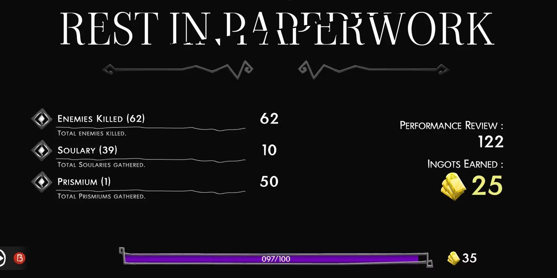 Как уже упоминалось выше, одним из основных (и гарантированных) способов получения слитков являются попытки пройти игру до конца. Разумеется, игроки Have a Nice Death получат значительно больше слитков, если им удастся пройти игру до конца, чем если их убьет первый босс. По окончании забега игроки будут оцениваться по количеству убитых врагов, количеству побежденных боссов и мини-боссов, а также по многим другим показателям. Таким образом, чем выше рейтинг, тем больше слитков получат игроки (а также больше опыта для перехода на следующий уровень).