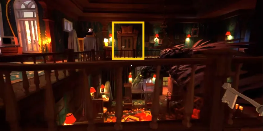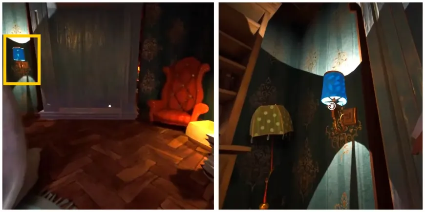 - Откройте скрытый путь между спальней соседа и книжной комнатой, потянув за синюю настенную лампу в дальнем правом углу.