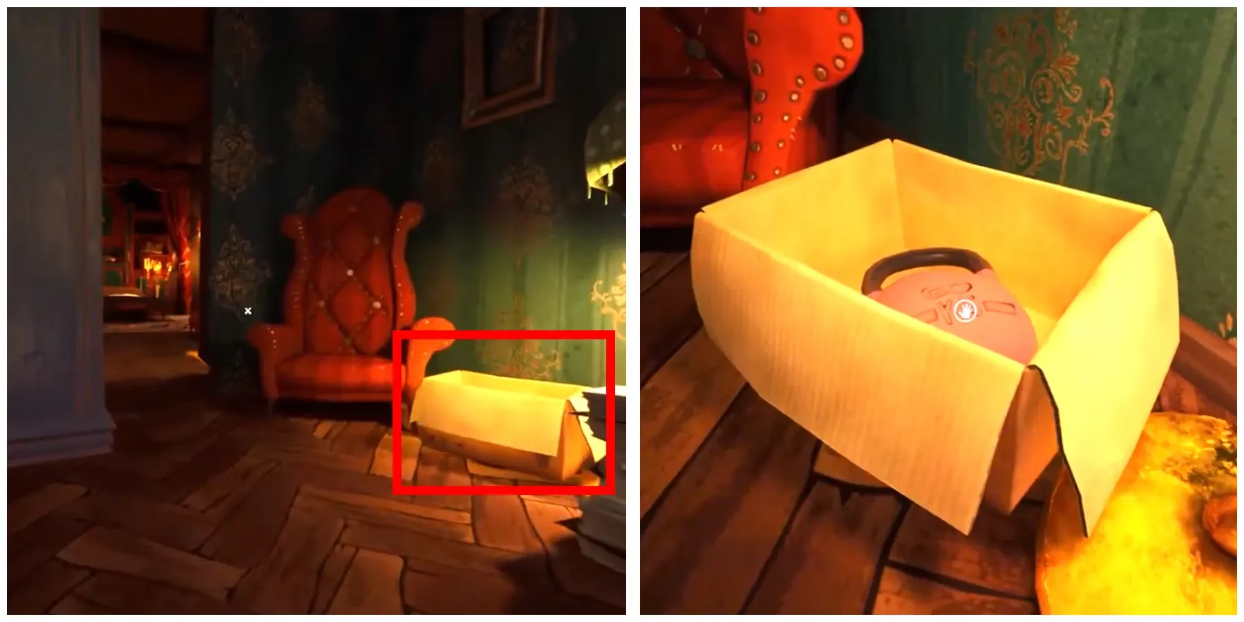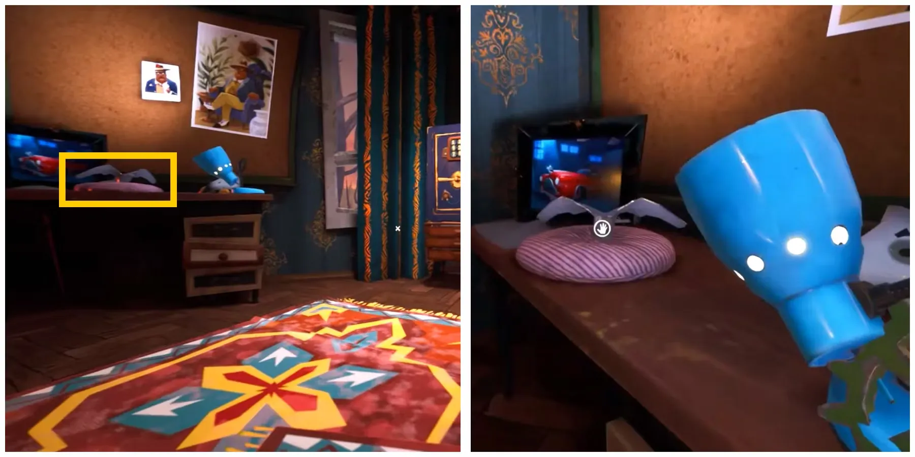 Желтая шестеренка находится в спальне соседа. Чтобы открыть потайное отделение над его кроватью, игроки должны: