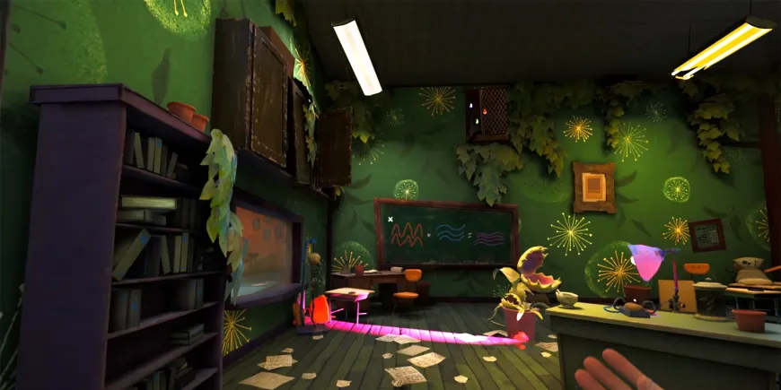 Чтобы решить головоломку химической лаборатории и получить ключ от сарая на заднем дворе в игре Hello Neighbor 2, игрокам необходимо открыть рот венериной мухоловки в лаборатории. Химическая лаборатория находится в главном здании школы на втором этаже, ее охраняет собака дворника. Чтобы открыть венерин рот, игроки должны раздобыть картофельную батарею, а также синий и красный баллончики.