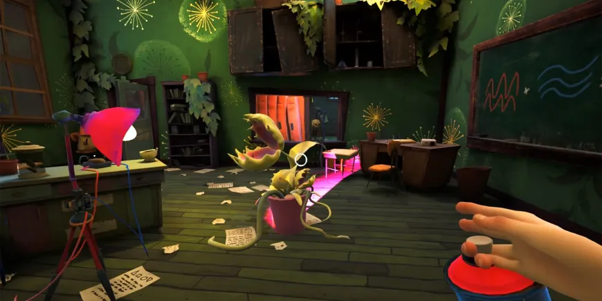 - Возьмите красный баллончик из инвентаря и опрыскайте светильник, стоящий напротив Венериной мухоловки.