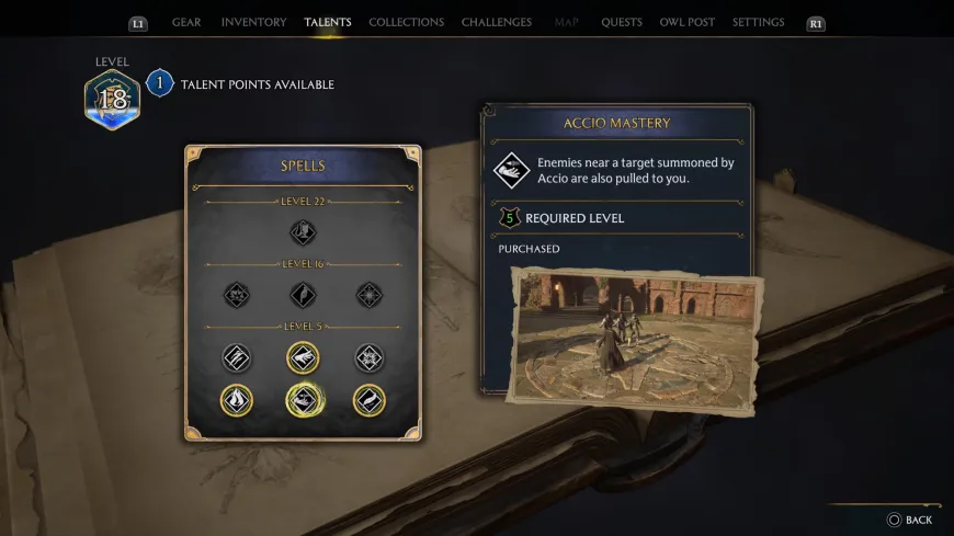 После траты очков таланта на повышение уровня мастерства Accio заклинание теперь будет притягивать врагов поблизости от первоначально выбранного врага. Таким образом, несколько целей будут приближены к игроку. Это заклинание может не подействовать на более тяжелых врагов, например, на большие статуи рыцарей, но врагов-людей или небольших монстров будет достаточно.