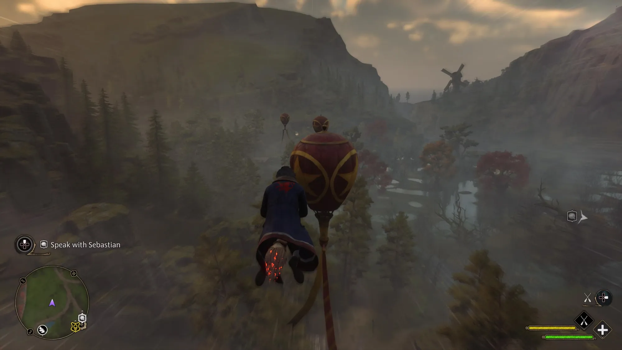Чтобы взобраться на метлу, убедитесь, что вы не находитесь в запретной для полетов зоне, затем нажмите левый бампер, а затем нажмите кнопку "Круг" (PlayStation) или "B" (Xbox).