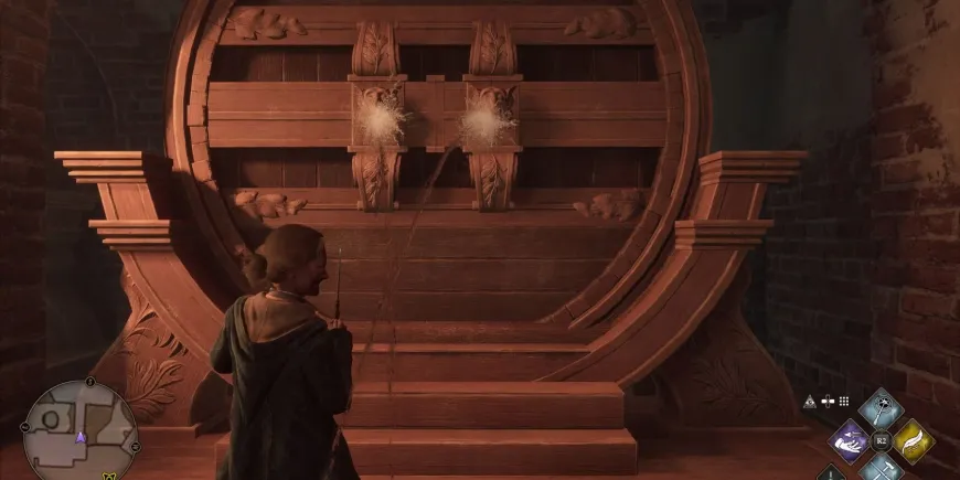 Затем игроки должны увидеть две огромные бочки у стены слева. Самая дальняя бочка - это секретный вход в общую комнату Хаффлпаффа. Игроки Хаффлпаффа, которые подойдут к бочке, увидят, как она освобождает им дорогу, чтобы они могли войти в общую комнату.