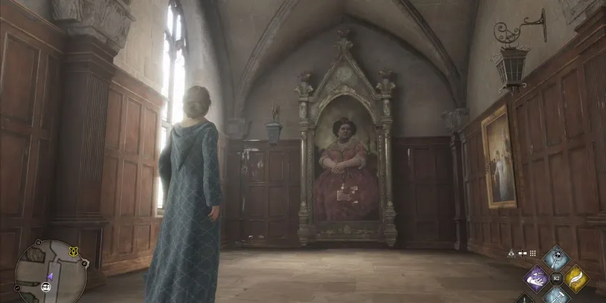 На вершине лестницы игроки должны посмотреть налево, чтобы увидеть коридор с портретом Толстой дамы в конце. Как помнят поклонники книг и фильмов о Гарри Поттере, портрет Толстой дамы - это секретный вход в общую комнату Гриффиндора.