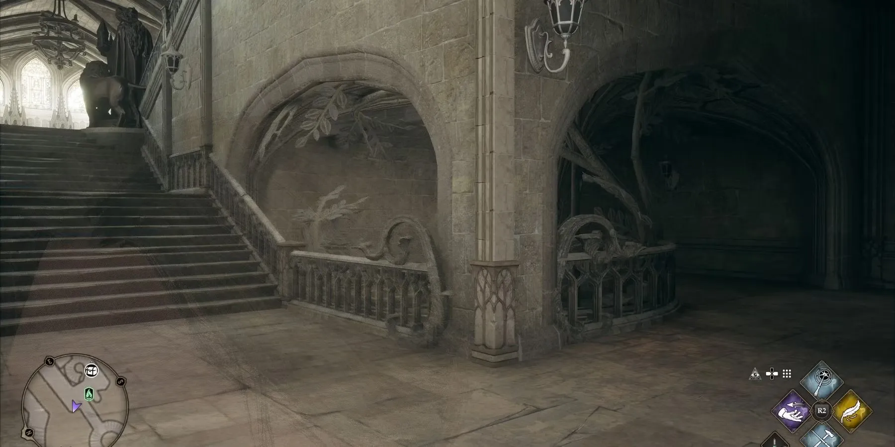 Посмотрев в сторону парадной лестницы, игроки должны заметить слева арку с растением, свисающим с потолка. В этом направлении находится общая комната Хаффлпаффа. Игроки должны направиться к парадной лестнице, но зайти за угол и спуститься по винтовой лестнице с обвивающими ее ветвями деревьев.
