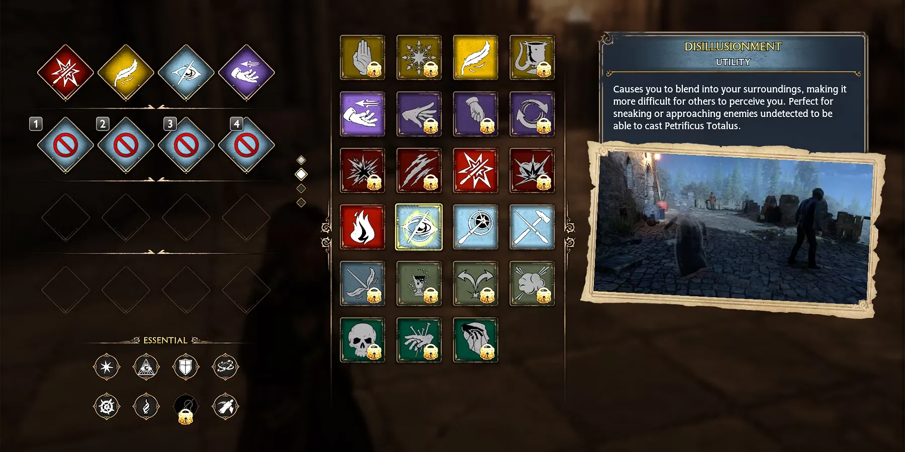 Согласно описанию игры, заклинание Disillusionment заставляет заклинателя слиться с окружающей средой, что затрудняет обнаружение его другими, например, врагами и стражниками. Это заклинание также идеально подходит для того, чтобы подкрадываться и приближаться к врагам для выполнения связывающего заклинания Petrificus Totalus.