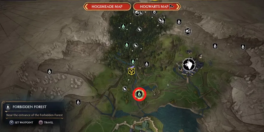 - Быстро переместитесь к путевой точке Запретного леса, которая находится рядом с входом, к юго-западу от Хогсмида на Карте мира.
