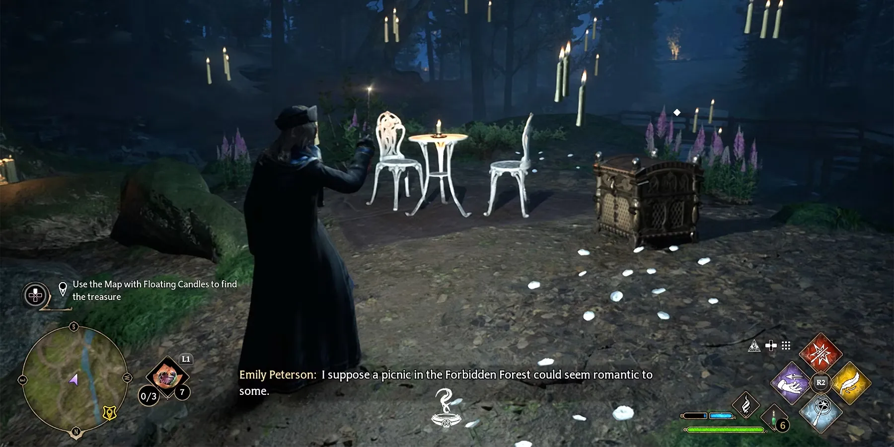 После этого появится куча парящих свечей, за которыми игроки должны следовать в Запретный лес, пока не достигнут поляны, полной свечей и столика на двоих, утопающего в романтическом сиянии.