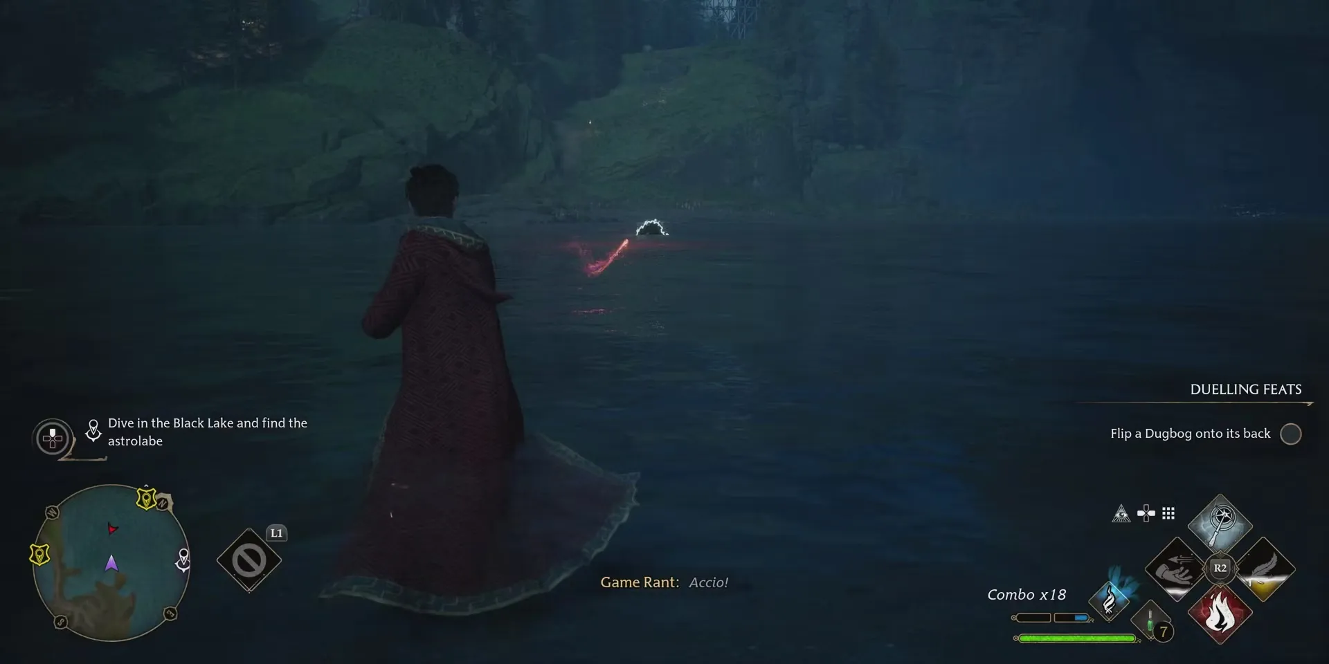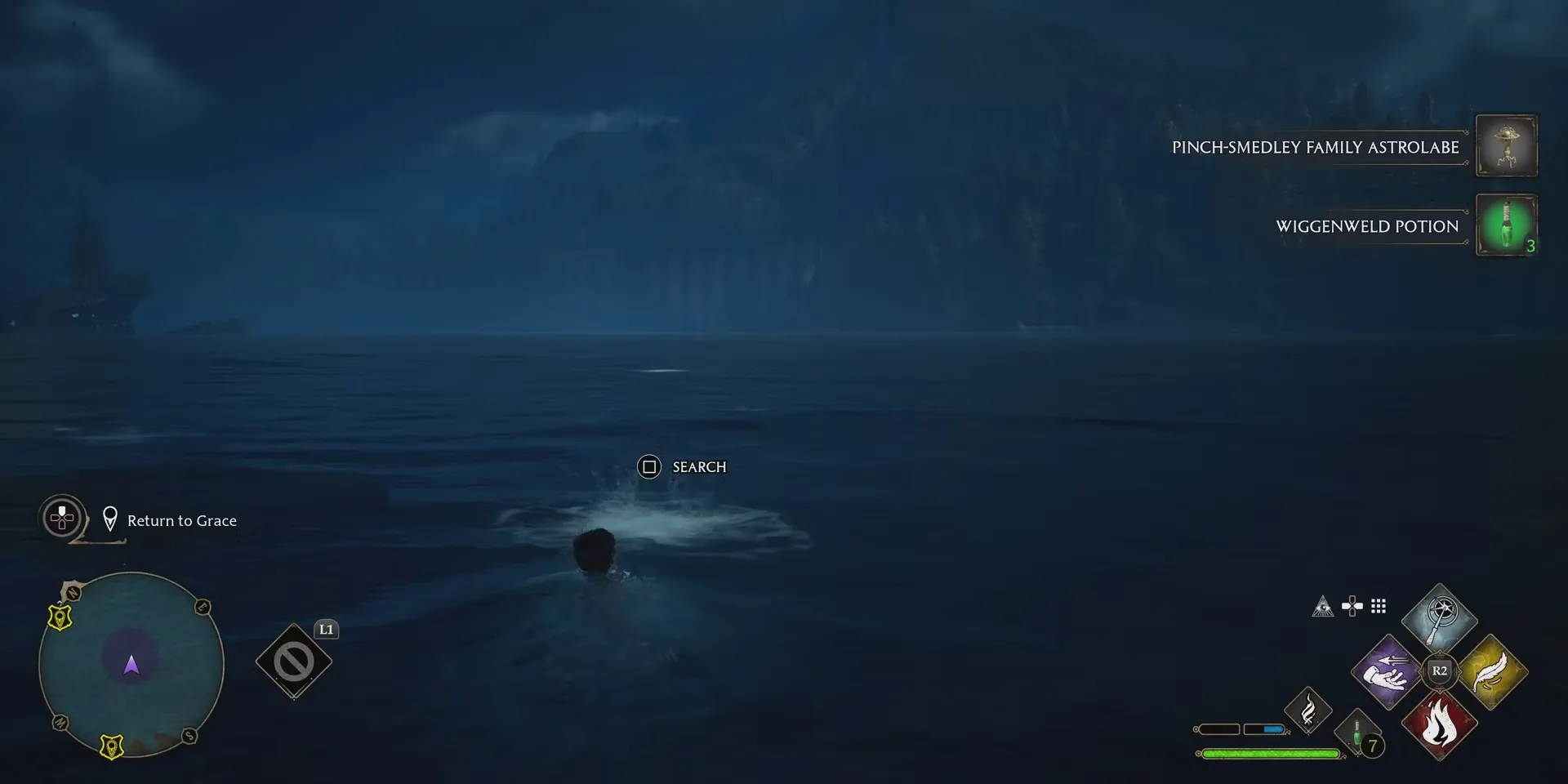 Грейс попросит помочь найти потерянную астролябию ее семьи, которая находится в воде к северо-востоку от причала. Чтобы добраться до нее, игрокам Hogwarts Legacy нужно будет просто прыгнуть в воду, а затем проплыть в направлении области, отмеченной на их карте. В воде им может встретиться один или два Дагбога, но поскольку игроки не смогут использовать свои палочки во время плавания, лучше обходить этих врагов стороной или доставать их с мелководья.