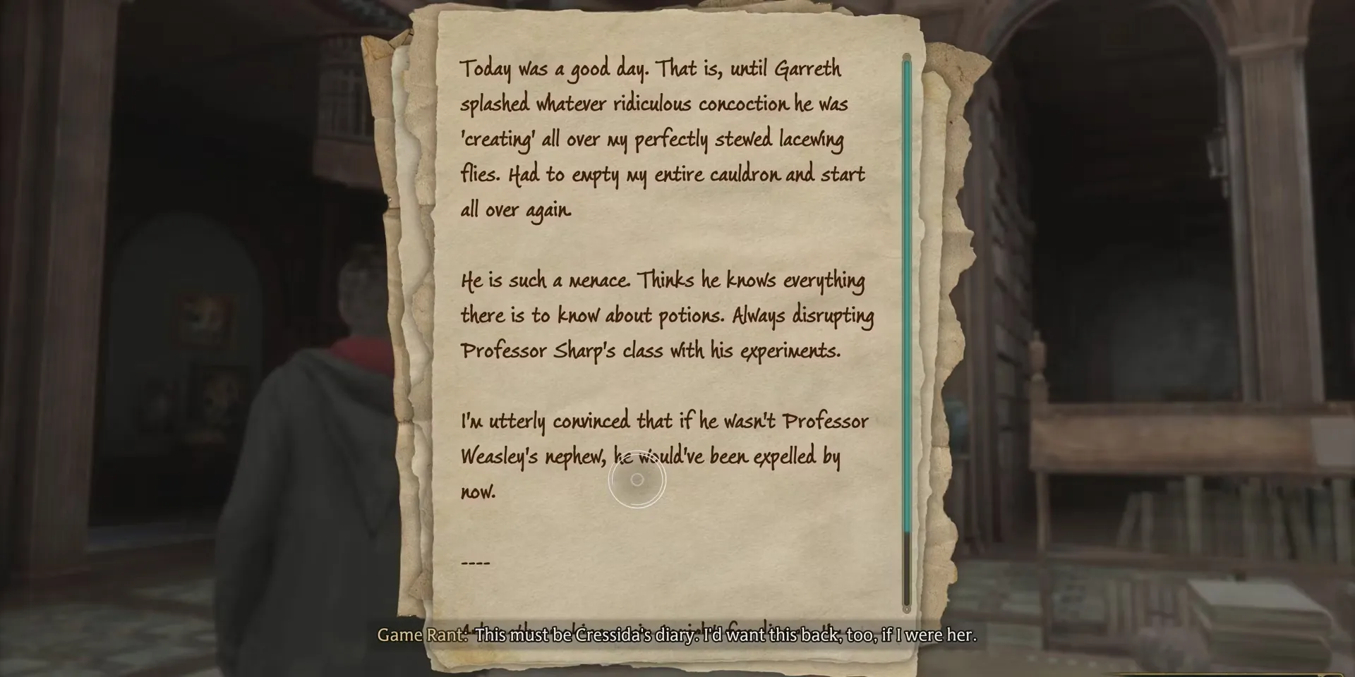 После того, как игроки найдут все пять книг, им будет предложено вернуться к Крессиде, которую снова можно найти в Центральном зале. Здесь будет диалог на выбор, хотя, похоже, нет никакой разницы, попытаются ли игроки шантажировать ее и потребовать награду или отдадут дневник добровольно. В любом случае, игроки получат 180 XP и рукоятку палочки Avian - Grey, с помощью которой можно изменить внешний вид палочки игрового персонажа.