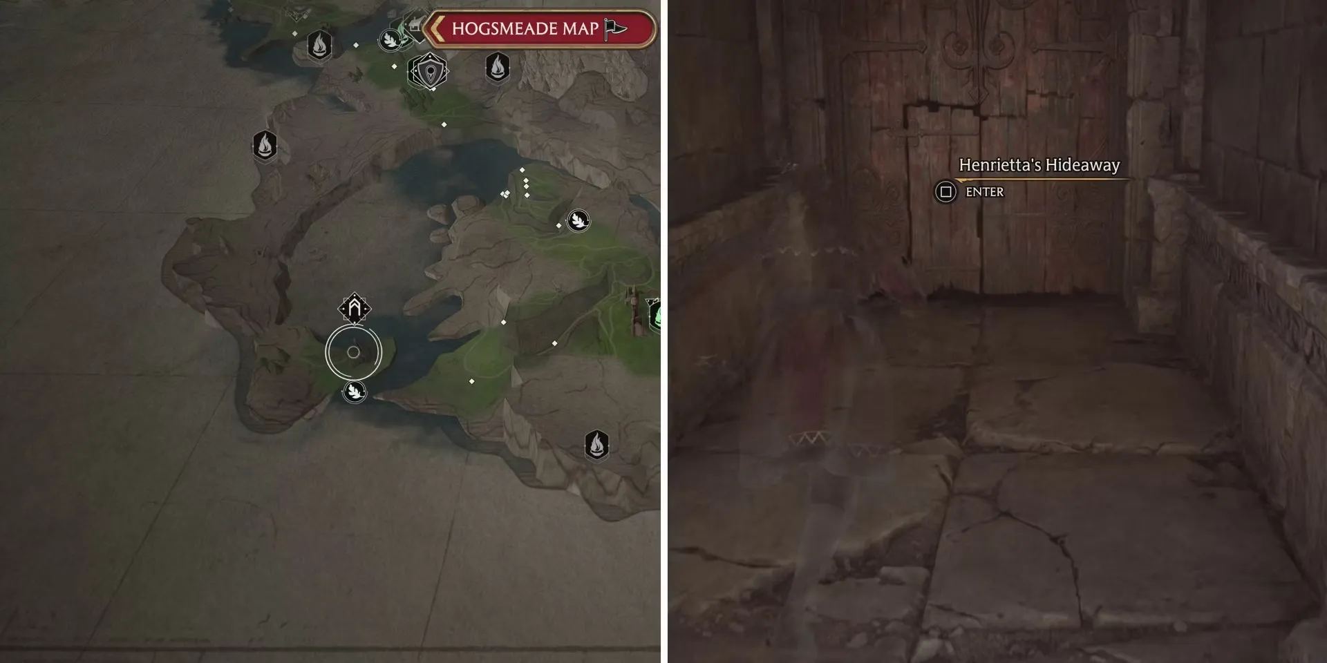 Прибыв в Manor Cape и очистив его от темных волшебников, которые ошиваются поблизости, игроки смогут попасть в убежище Генриетты через большие деревянные двери в зоне под Испытанием Мерлина. Чтобы пройти через первую комнату, нужно с помощью Accio или Wingardium Leviosa переместить куб на круг с сосулькой, а затем использовать заклинание Glacius, чтобы куб начал светиться. Затем нужно встать на круг с изображением пламени и произнести Incendio.