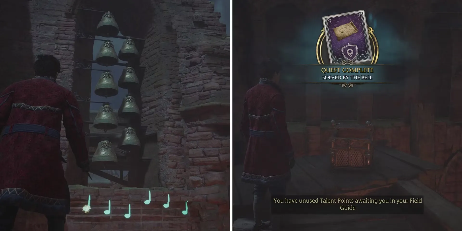 После того как игроки ударят по колоколам в правильном порядке, они услышат знакомую мелодию, а слева от них появится специальный сундук с сокровищами. Внутри него они найдут Длинный плащ искателя сокровищ: косметический предмет, который можно использовать для изменения внешнего вида некоторых предметов снаряжения. Они также получат 400 галеонов, а также обычные 180 XP.