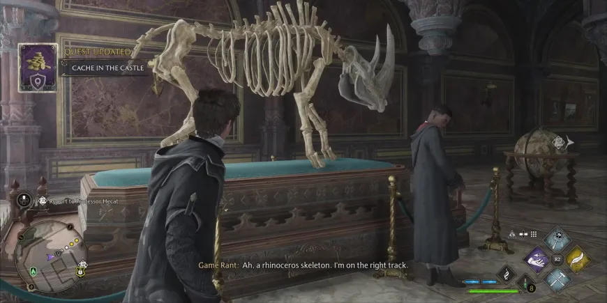 Первая подсказка, необходимая для выполнения побочного задания "Тайник в замке" в Hogwarts Legacy, находится недалеко от места начала побочного задания. Чтобы добраться до нее, игрокам нужно спуститься на три этажа по лестнице рядом с Артуром. Затем нужно пройти по дорожке слева и спуститься по центральной лестнице слева, и в этот момент справа перед игроками окажется скелет носорога.