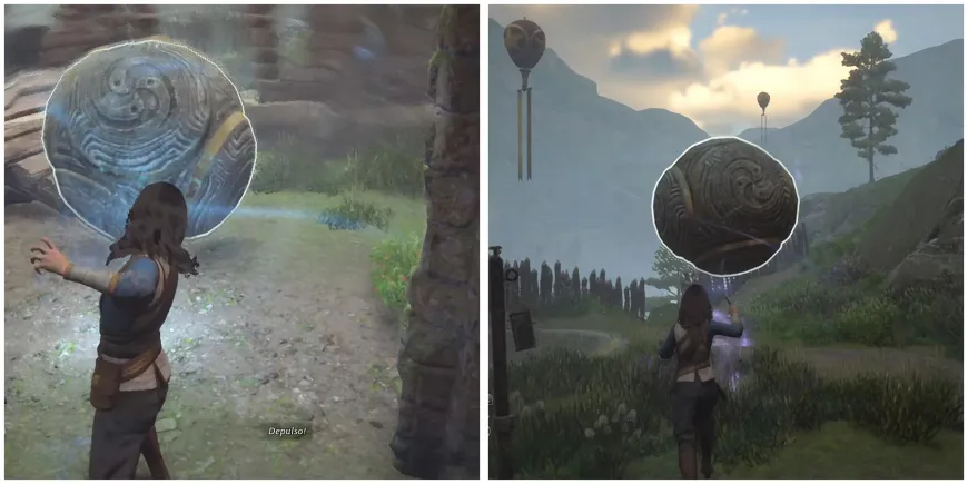 Чтобы решить это испытание, игрокам нужно вернуть сферу на место, но она заперта за воротами. Они открываются только при наложении Depulso на механизм. Далее подойдите к сфере и используйте то же заклинание, чтобы вытолкнуть ее из здания.