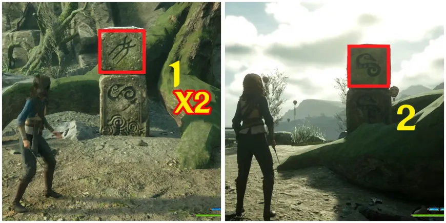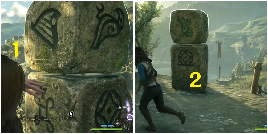 Поднимитесь по лестнице на юг, чтобы добраться до последней колонны. Чтобы решить головоломку в Hogwarts Legacy, примените Flipendo на первый символ один раз, а затем также один раз на второй верхний куб.