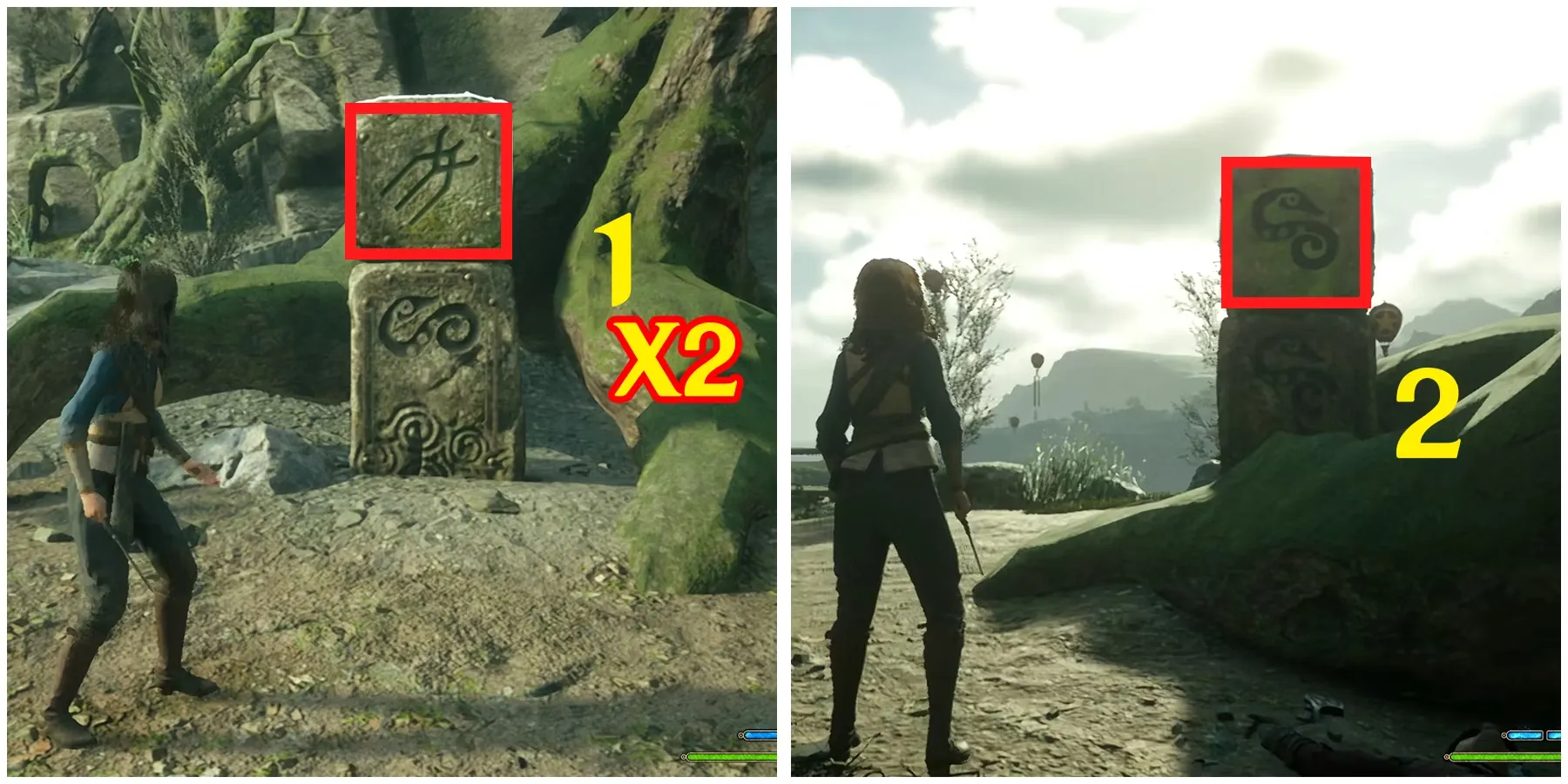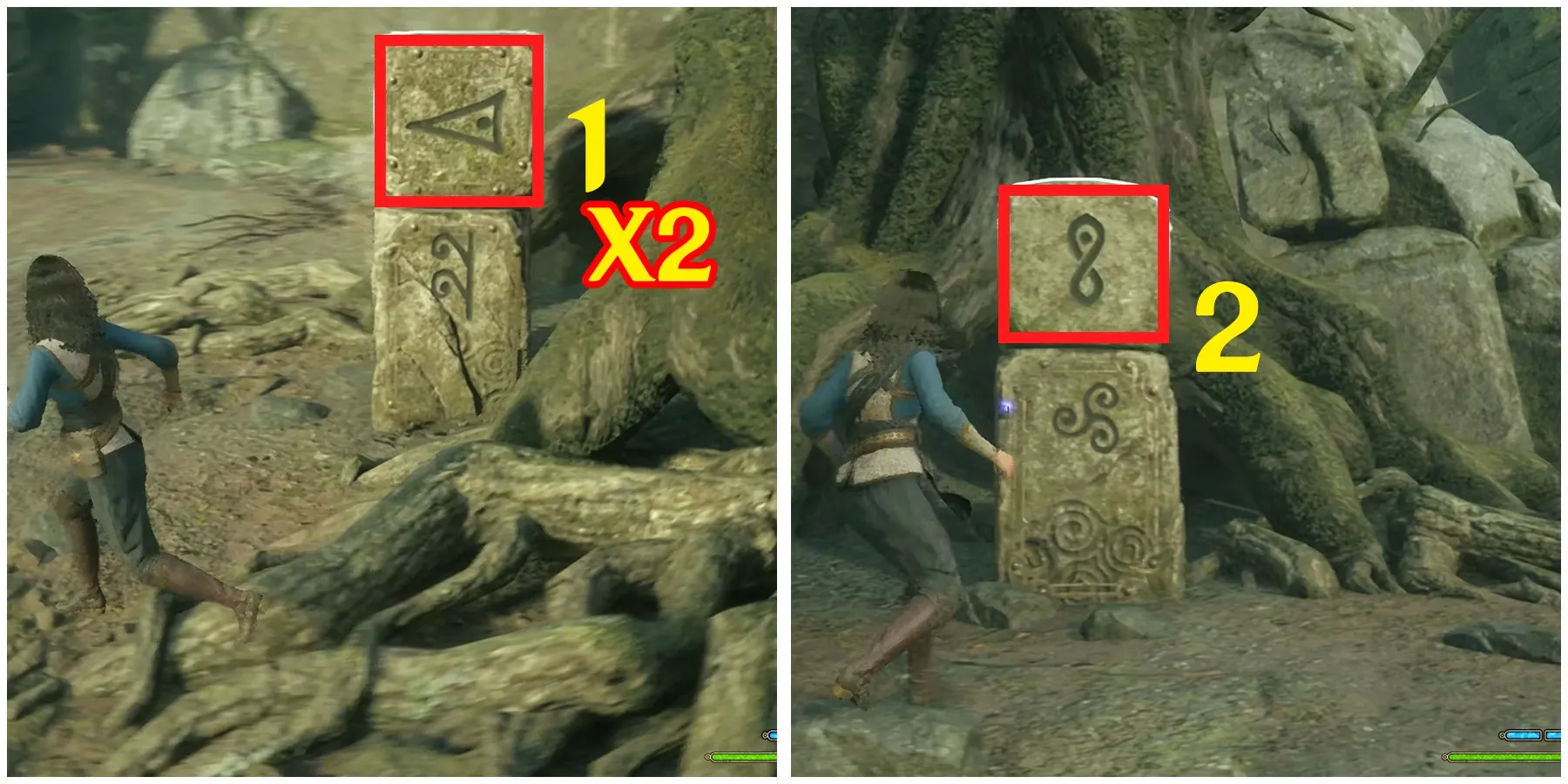 Бегите к северному столбу и дважды ударьте по верхнему кубу с этой стороны. Затем один раз ударьте по второму символу, чтобы совместить верхние и нижние символы.