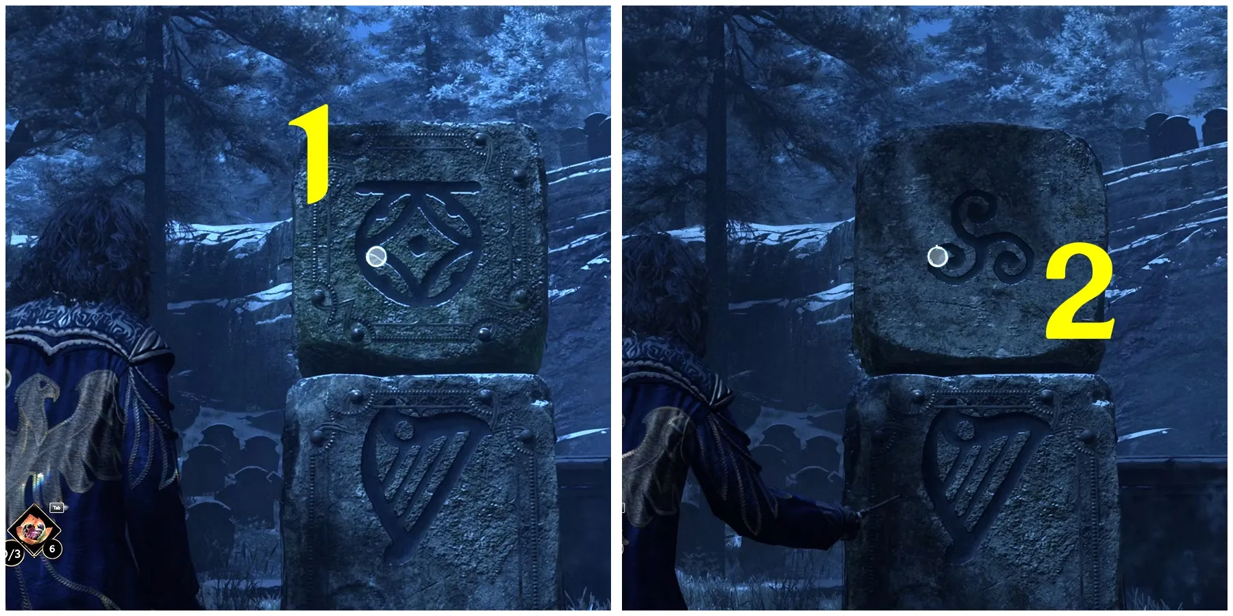 Последнее испытание Мерлина в Hogwarts Legacy можно найти к востоку от путевой точки Башни Сан-Бакара. Чтобы пройти его, игрокам нужно разгадать три куба с символами, разбросанные по кладбищу. Куб с символами можно разгадать, сопоставив верхний символ с соответствующим нижним. Для этого игрокам нужно произнести заклинание Flipendo, чтобы перевернуть верхний кубик, при этом перед произнесением заклинания нужно встать на правильную сторону.