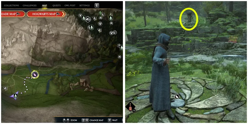 Вокруг локации испытания Мерлина разбросаны четыре сломанные статуи. Как и в большинстве других испытаний Мерлина в Hogwarts Legacy, игроки могут использовать заклинание Revelio, чтобы найти разбитые статуи в округе, и использовать заклинание Reparo, чтобы починить их.