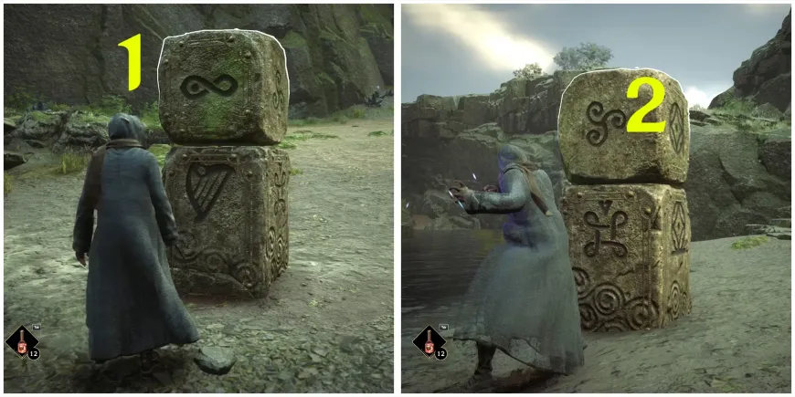 Это испытание Мерлина находится к западу от Floo Flame Гробницы Джекдау, рядом с озером с 3 кубами с символами. Игроки должны совместить символы на верхнем и нижнем кубе, используя Flipendo, чтобы изменить положение верхнего куба.
