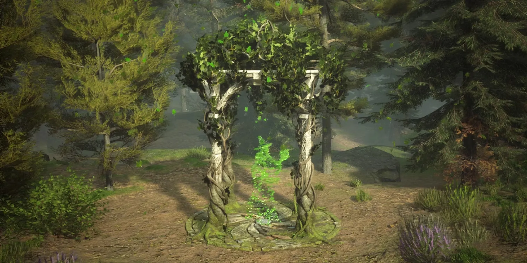 Это испытание Мерлина расположено к юго-западу от путевой точки "Гробница дрока", а добраться до него можно, прилетев из путевой точки Floo Flame в запретном лесу. Когда игроки активируют это испытание, статуя сломается, указывая на то, что ее нужно починить, чтобы решить головоломку.