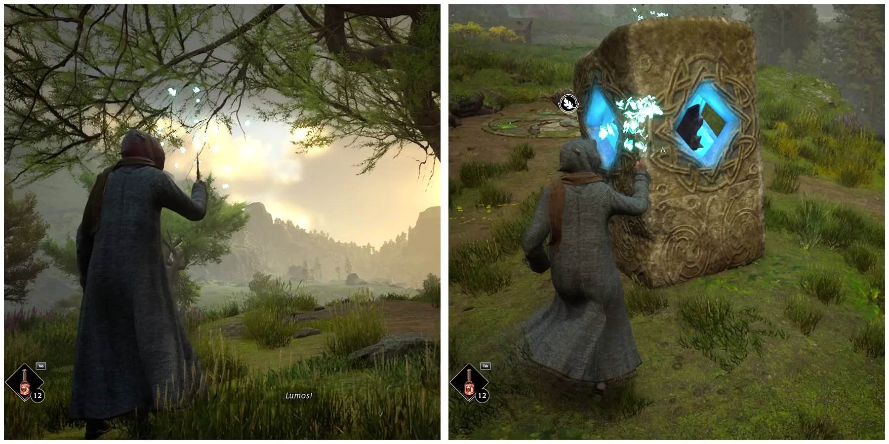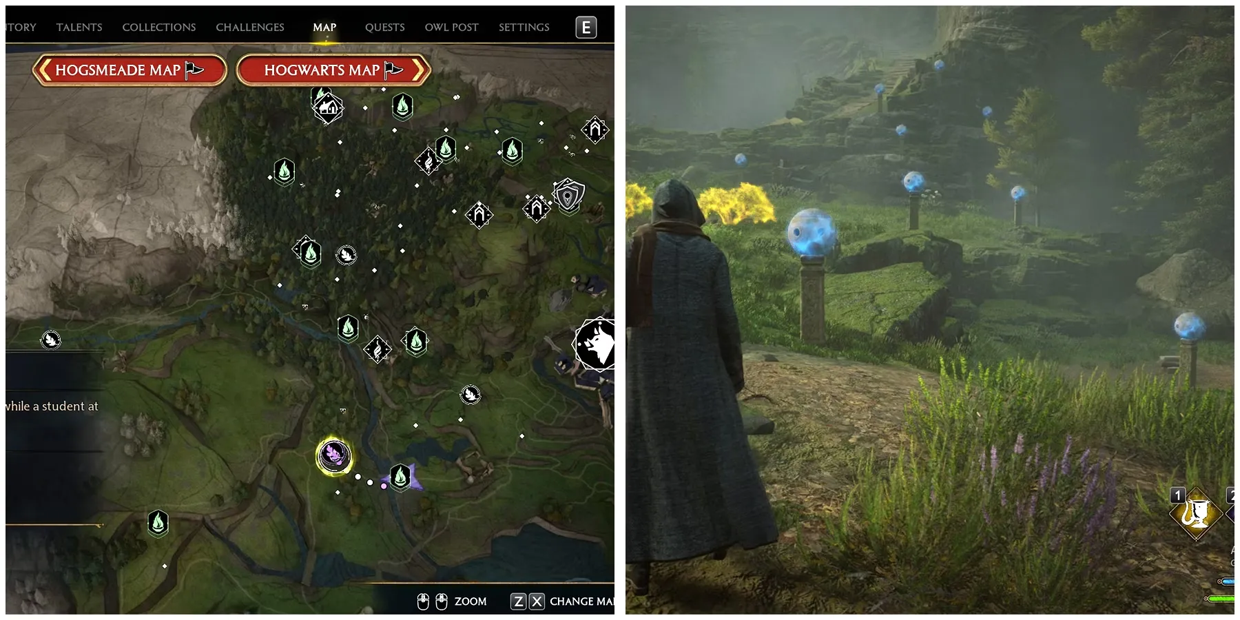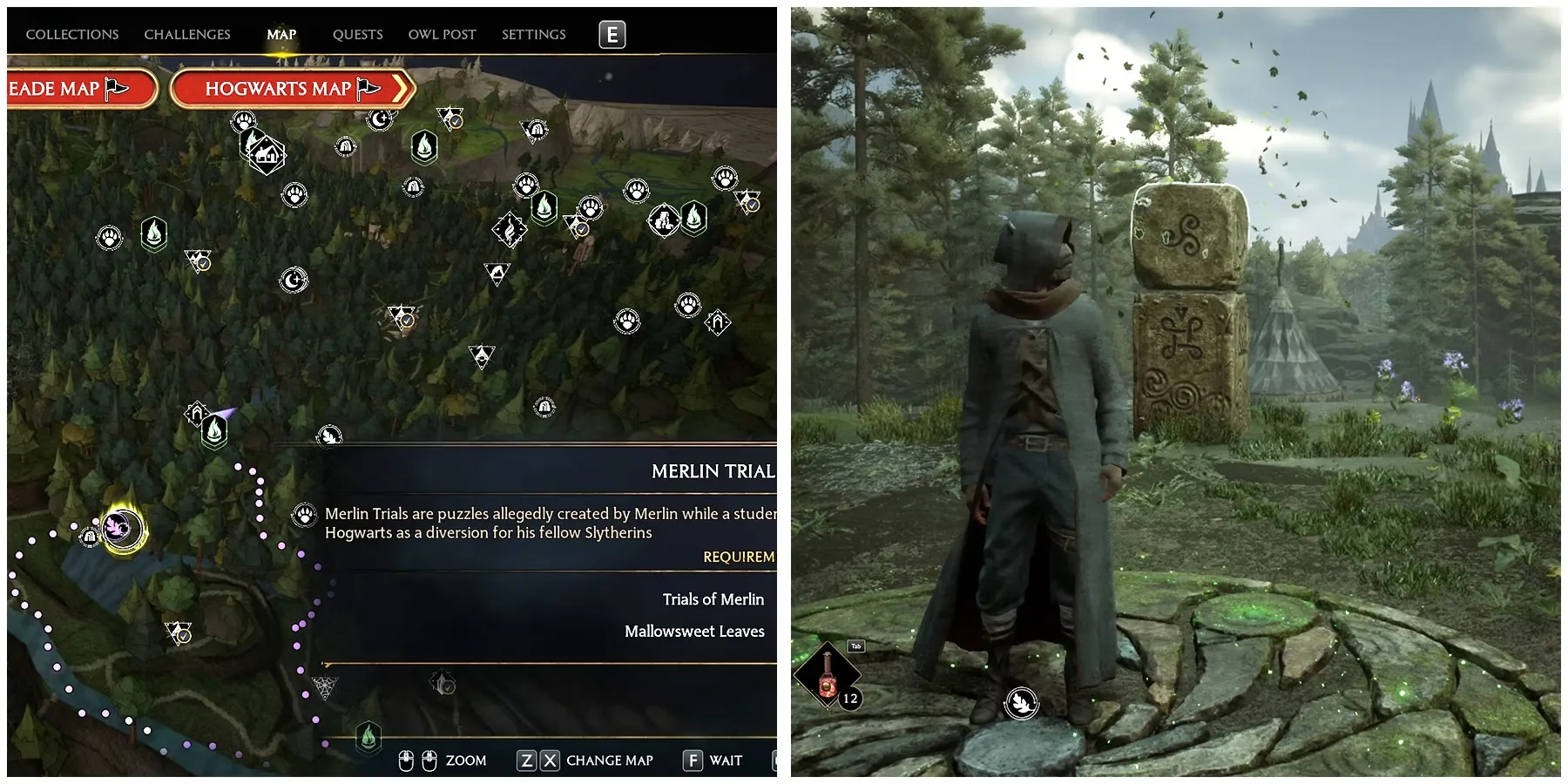 Одно из испытаний Мерлина в северном регионе Хогвартса можно найти к западу от путевой точки запретного леса. Это начальное испытание включает в себя простую головоломку, требующую от игроков уничтожить девять сфер.