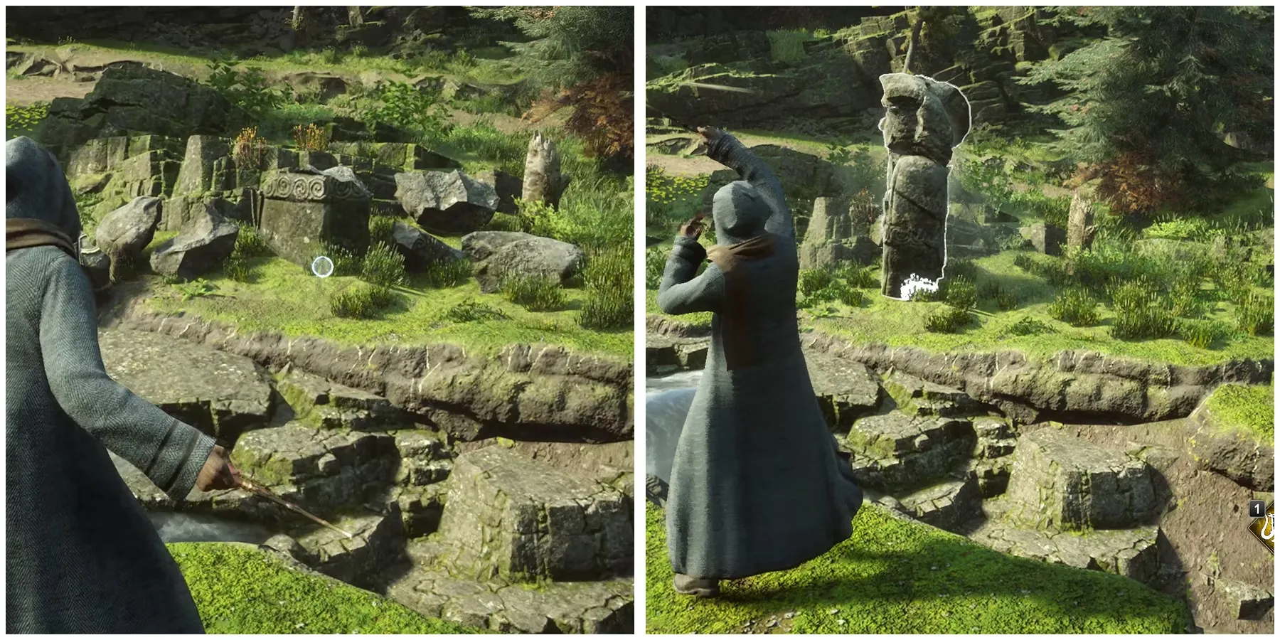 Вокруг локации испытания Мерлина разбросаны четыре сломанные статуи. Как и в большинстве других испытаний Мерлина в Hogwarts Legacy, игроки могут использовать заклинание Revelio, чтобы найти разбитые статуи в округе, и использовать заклинание Reparo, чтобы починить их.