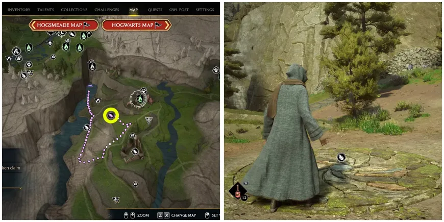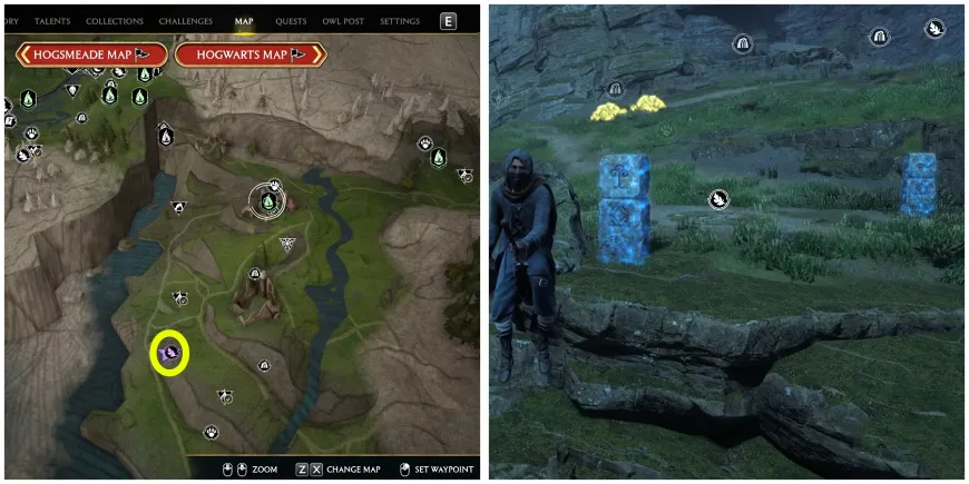 И снова каменная сфера. Игроки могут найти ее в центре региона побережья Пойдсир, и она легко доступна из большинства Floo Flames в этом регионе. Каменная сфера, необходимая для решения этой головоломки, находится прямо рядом с испытанием Мерлина, поэтому все, что остается, - это применить Revelio и найти каменную яму, которая находится к югу от алтаря Мерлина.