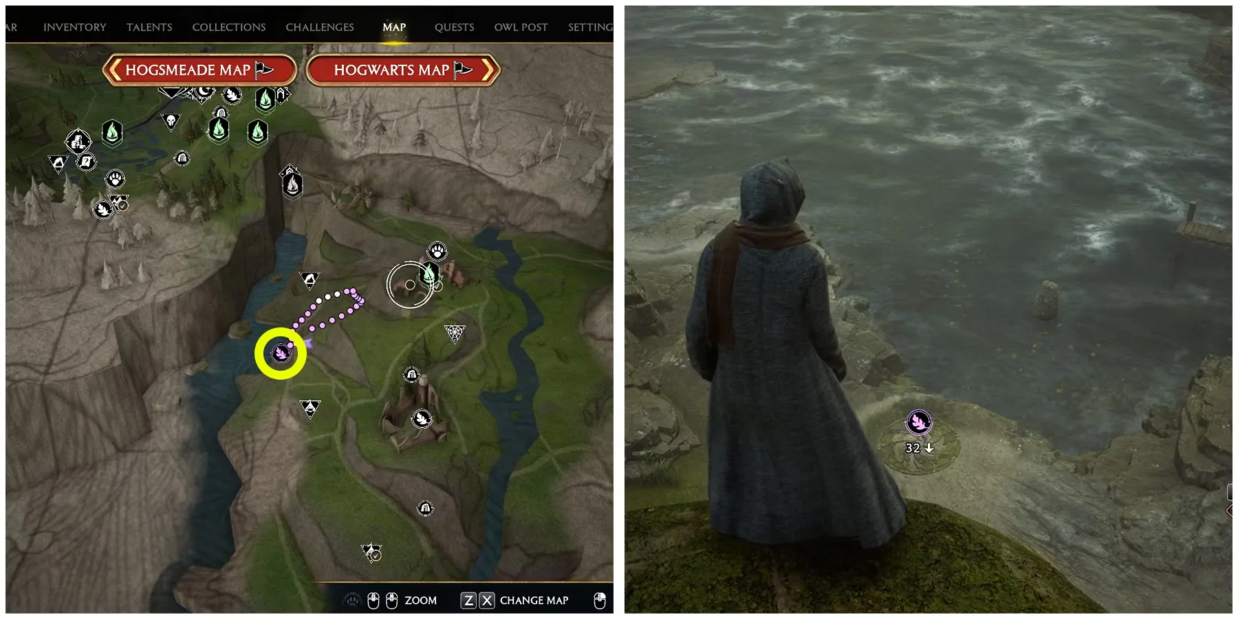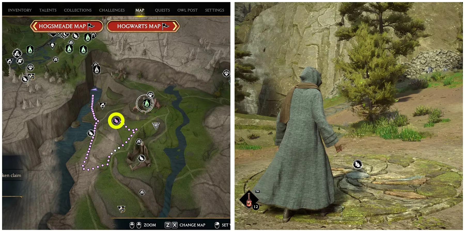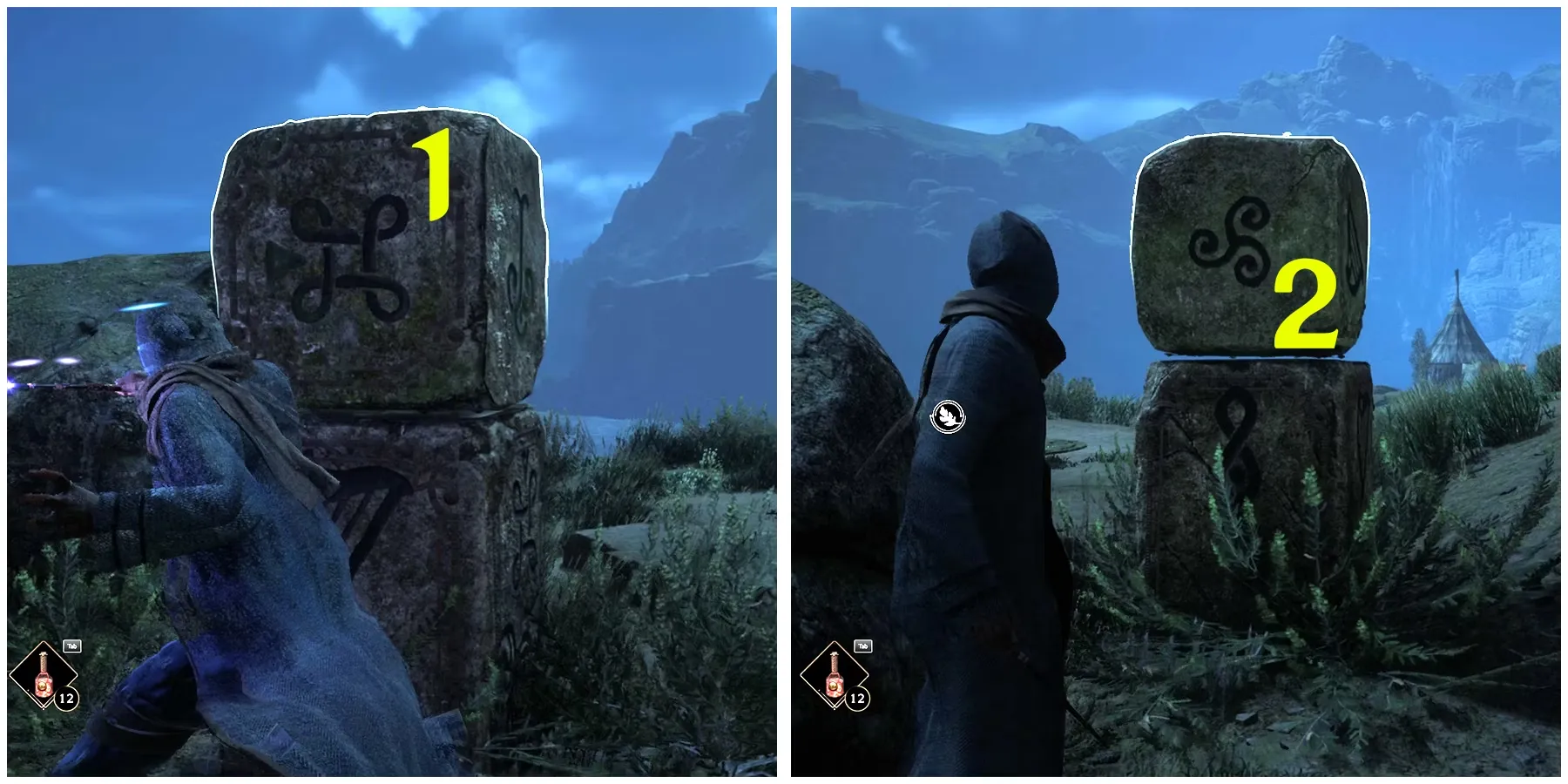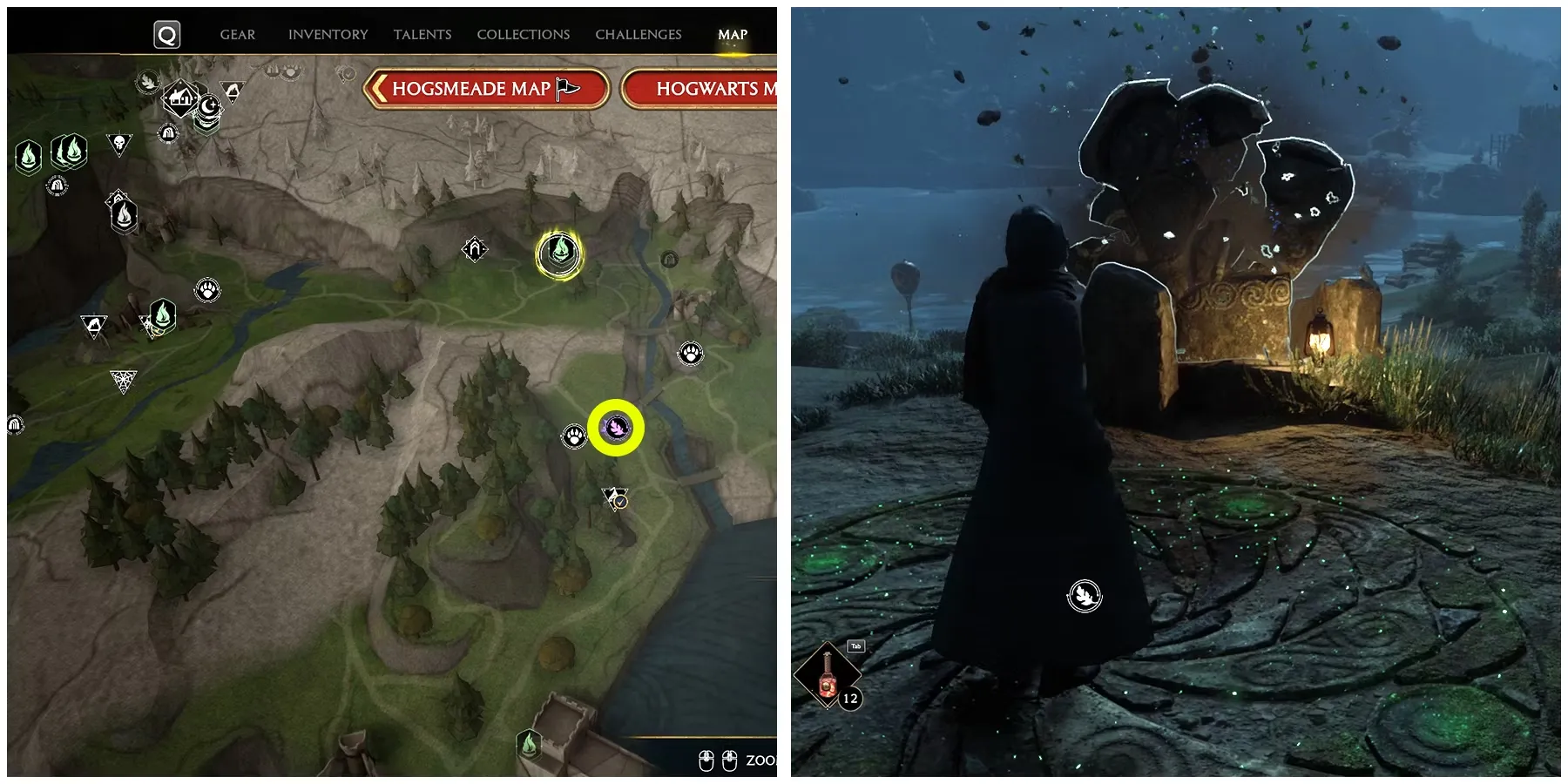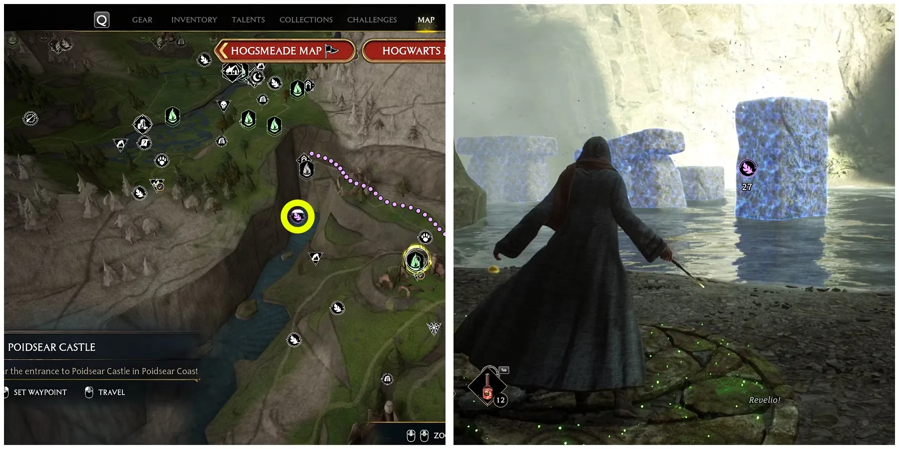 И снова каменная сфера. Игроки могут найти ее в центре региона побережья Пойдсир, и она легко доступна из большинства Floo Flames в этом регионе. Каменная сфера, необходимая для решения этой головоломки, находится прямо рядом с испытанием Мерлина, поэтому все, что остается, - это применить Revelio и найти каменную яму, которая находится к югу от алтаря Мерлина.