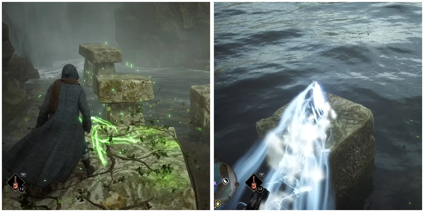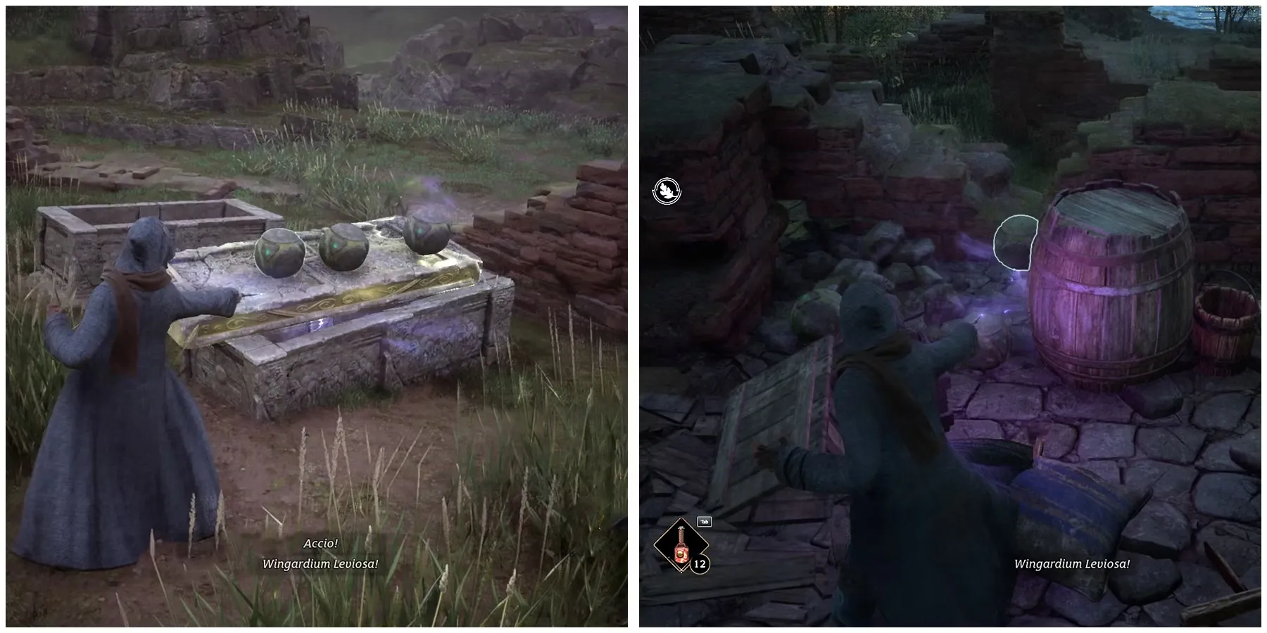 Последние две группы орбов найти сложнее. Одна группа находится на вершине каменной гробницы с подвижной плитой. Если орбы упадут внутрь гробницы, игроки могут использовать Wingardium Leviosa вместо Accio, чтобы вытащить их и поместить на следующую платформу.