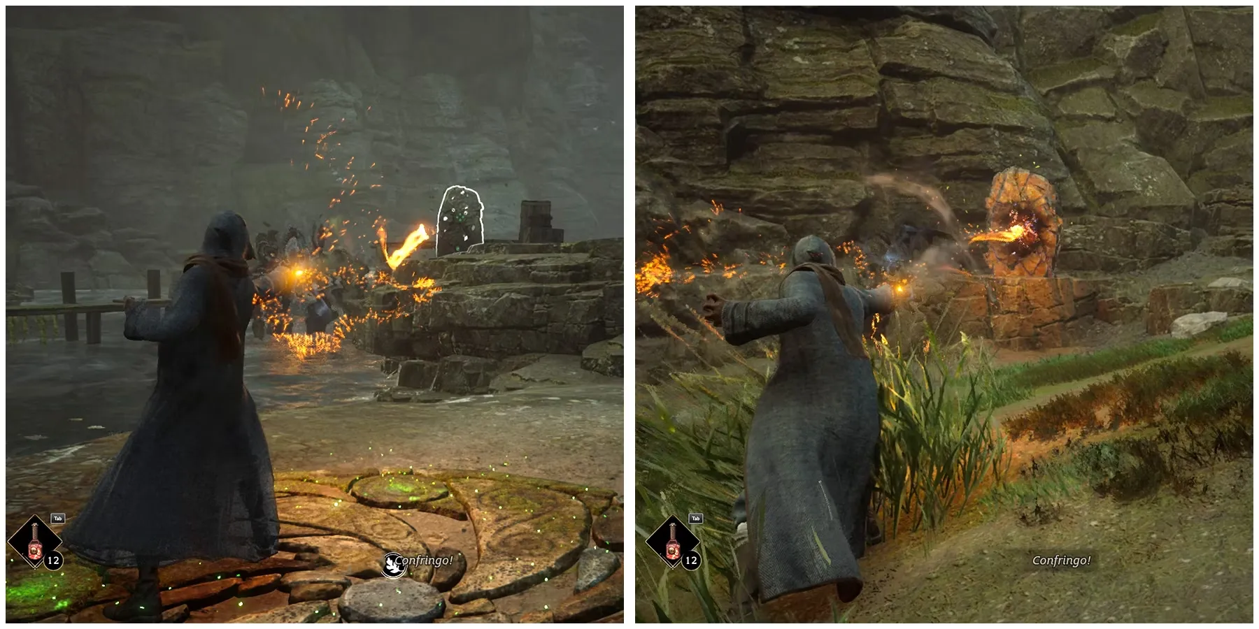 При активации испытания Мерлина игроки должны будут разрушить пять каменных столбов. Все столбы находятся в пределах досягаемости персонажа, но один из них трудно обнаружить, так как он не на виду. Протагонисты могут использовать Revelio, чтобы легко обнаружить все пять столбов. Кроме того, игроки могут применить одно заклинание Confringo или два Bombarda, чтобы разрушить столбы.