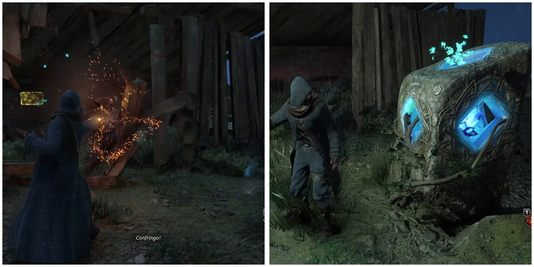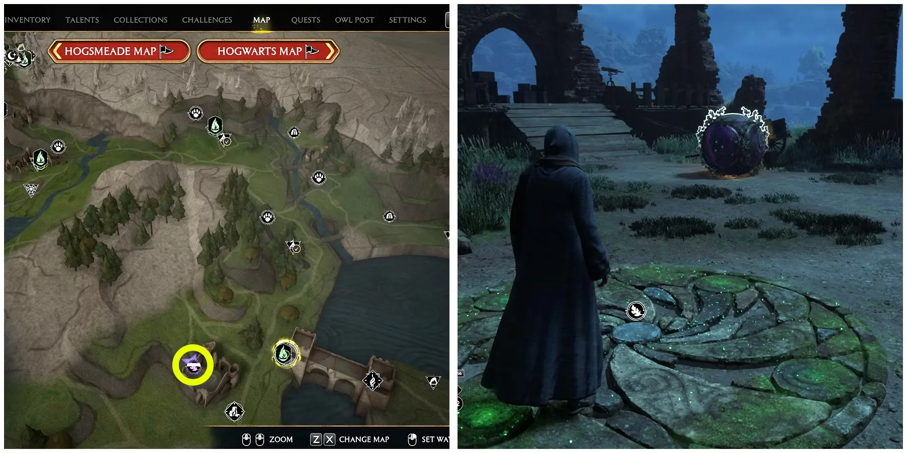 Чтобы найти яму, игроки могут использовать заклинание Revelio, чтобы найти ее под деревянной доской, которую игроки могут разрушить с помощью Confringo. Кастуйте Wingardium Leviosa, чтобы отнести каменную сферу к яме и поместить ее внутрь, чтобы завершить испытание Мерлина.