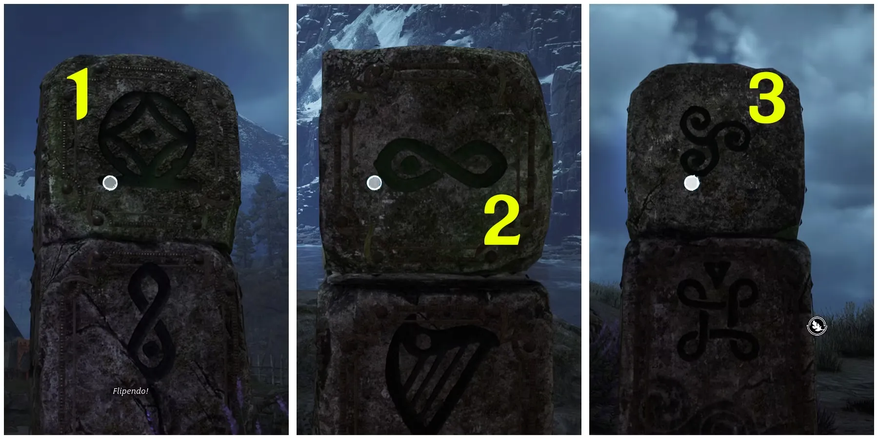 Это испытание Мерлина расположено к юго-западу от Floo Flame замка Пойдсир. Чтобы пройти это испытание, игроки должны разгадать три куба с символами, расположенные вокруг него. Нижний куб не реагирует на заклинания, а верхний можно перевернуть, только применив к нему заклинание Flipendo.