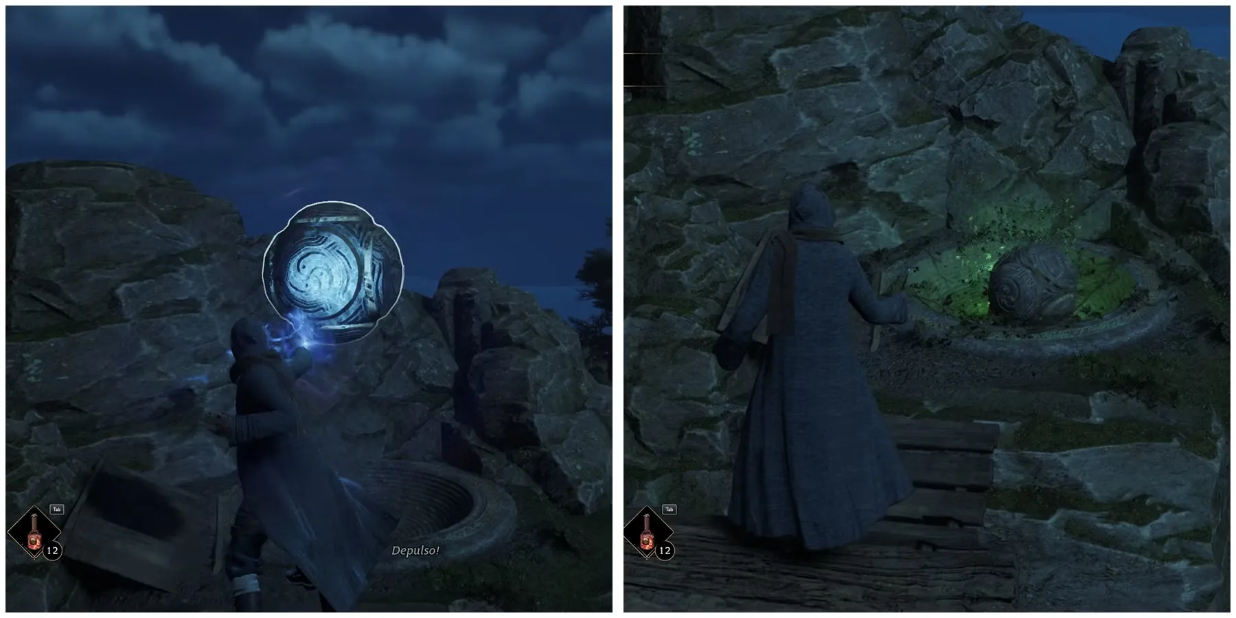 Чтобы решить испытание Мерлина, возьмите каменную сферу с помощью Wingardium Leviosa и перемещайте ее поблизости от ямы, пока не достигнете изломанного пути. Оттуда поднимите сферу в воздух и произнесите Depulso, чтобы приземлить ее прямо в каменную яму.