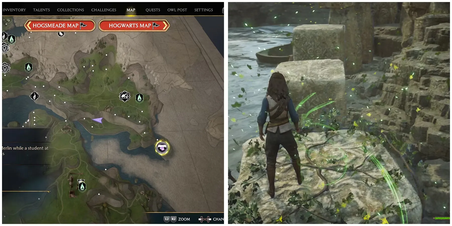 Как и предыдущее испытание, четвертое испытание Мерлина находится довольно далеко, поэтому лучшим вариантом будет использование маунта или метлы в Hogwarts Legacy. Чтобы добраться до испытания, летите на восток, пока не увидите алтарь возле пляжа.