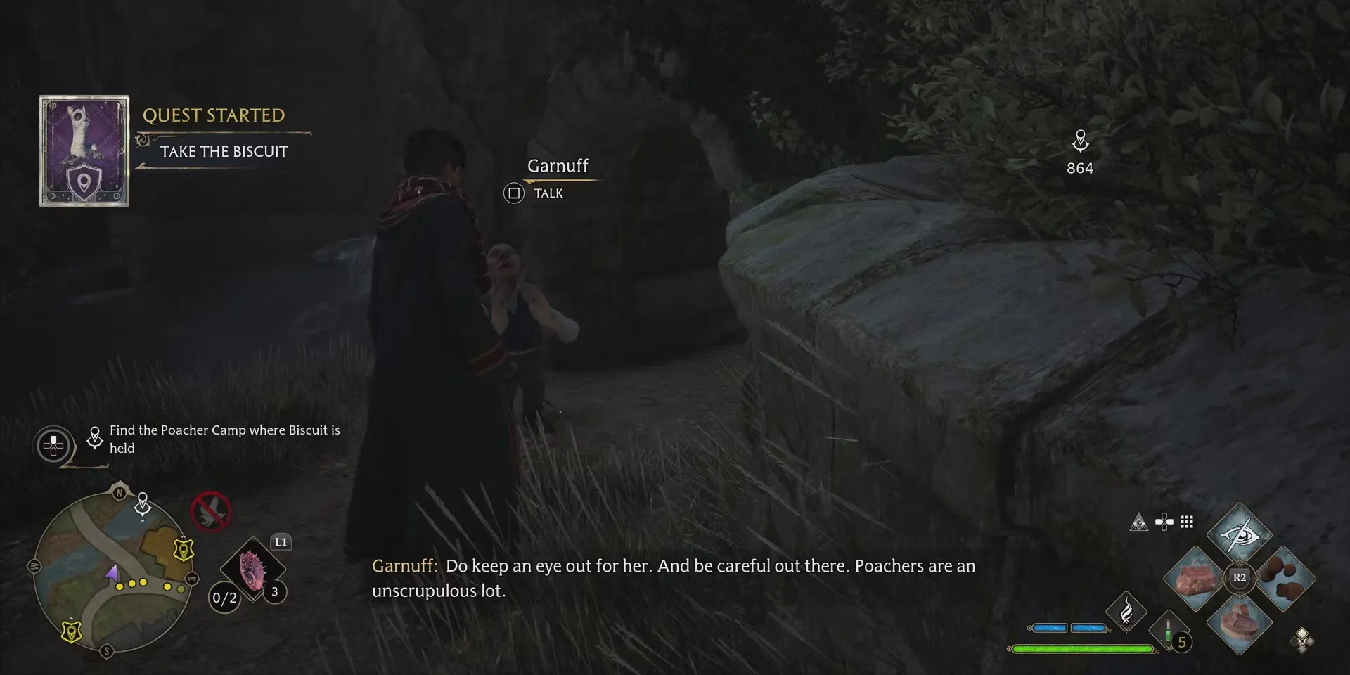 После разговора с Гарнуфом игроки узнают, что его любимое животное Лунный кальф Печенька было похищено браконьерами, и гоблин умоляет их вернуть его домой в целости и сохранности. Если они согласятся, игроки должны использовать Floo Flames для быстрого перемещения в Верхний Хогсфилд, а затем лететь на север на своей метле, пока не доберутся до лагеря браконьеров, отмеченного на карте.