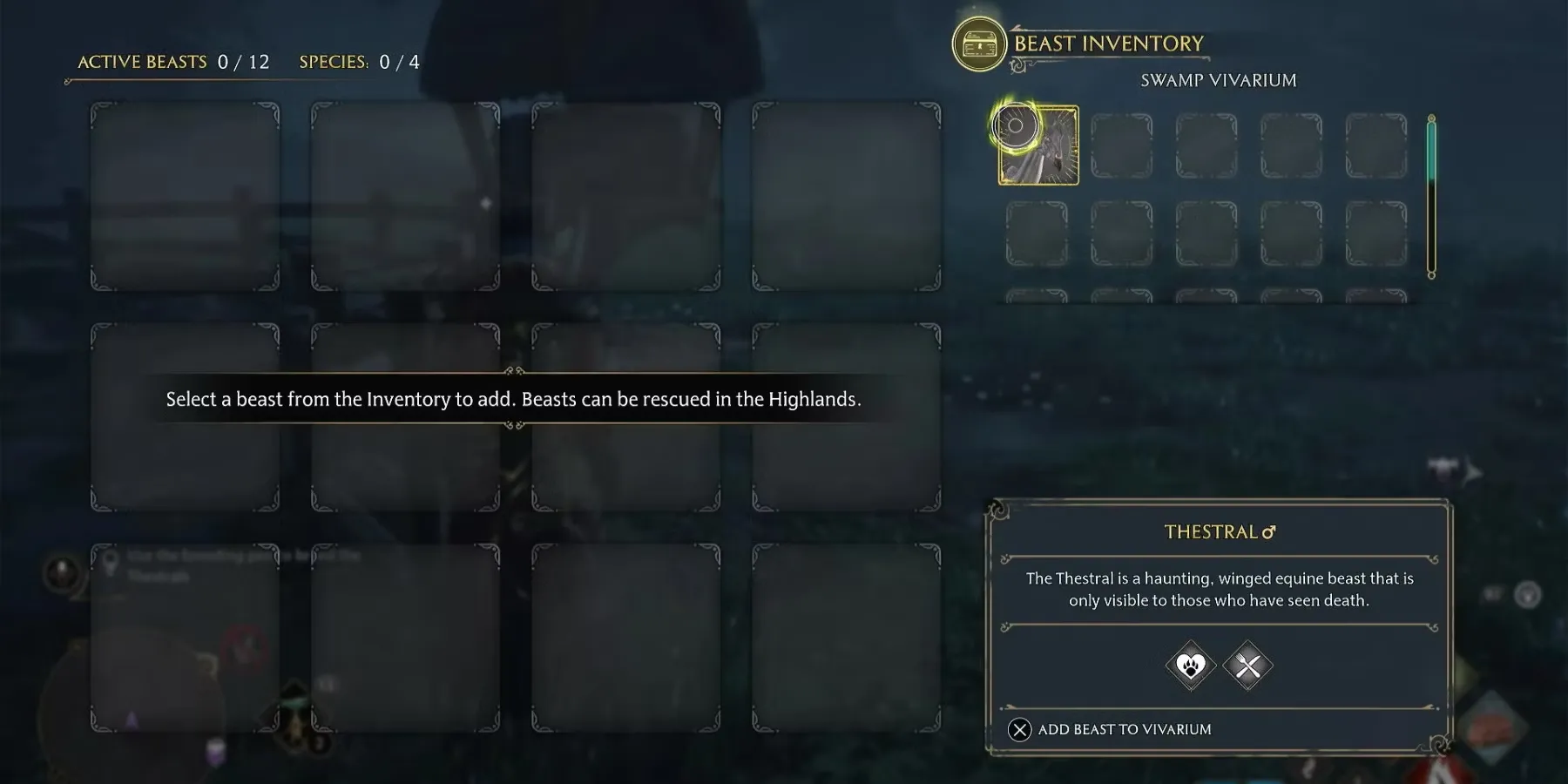 Чтобы игроки могли захватывать зверей, они должны сначала выполнить главный квест "Эльф, мешок и ткацкий станок", после чего они получат необходимые для этого средства. Затем игроки должны поговорить с Диком и завершить побочный квест "Участь домового эльфа", после чего приступить к выполнению квеста "Жеребенок мертвеца". После завершения квеста "Жеребенок мертвеца" игроки должны приобрести в магазине Tomes and Scrolls в Хогсмиде ручку для разведения зверей и поместить ее в свой виварий.
