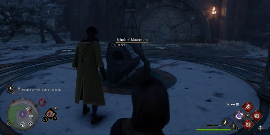 Чтобы открыть путь вперед, игроки должны применить заклинание Accio к своему алмазу заклинаний и использовать его для перемещения столбов вокруг Лунного камня. Для того чтобы дверь открылась, столбы нужно поставить на определенные места, и, к счастью, светящиеся символы на двери показывают, на какие места они встают.