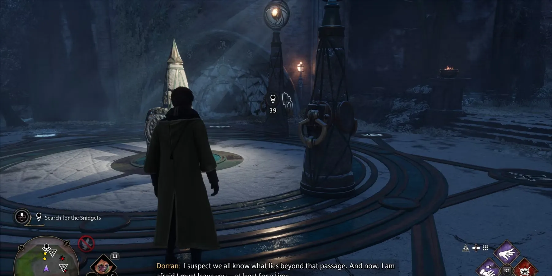 Чтобы открыть путь вперед, игроки должны применить заклинание Accio к своему алмазу заклинаний и использовать его для перемещения столбов вокруг Лунного камня. Для того чтобы дверь открылась, столбы нужно поставить на определенные места, и, к счастью, светящиеся символы на двери показывают, на какие места они встают.