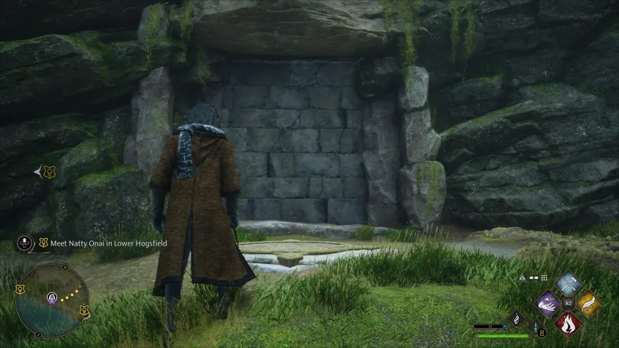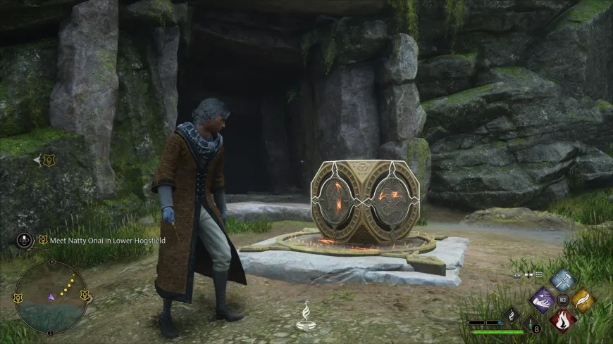 В боковой части скалы будет каменная стена, и игроки могут заметить поблизости куб с символом огня на нем. Перед каменной стеной также находится своеобразный каменный постамент, и игрокам нужно будет поднести куб к постаменту, а затем ударить по нему огненным заклинанием. Чтобы сделать все это, игрокам понадобятся как минимум два заклинания: Accio и Incendio.