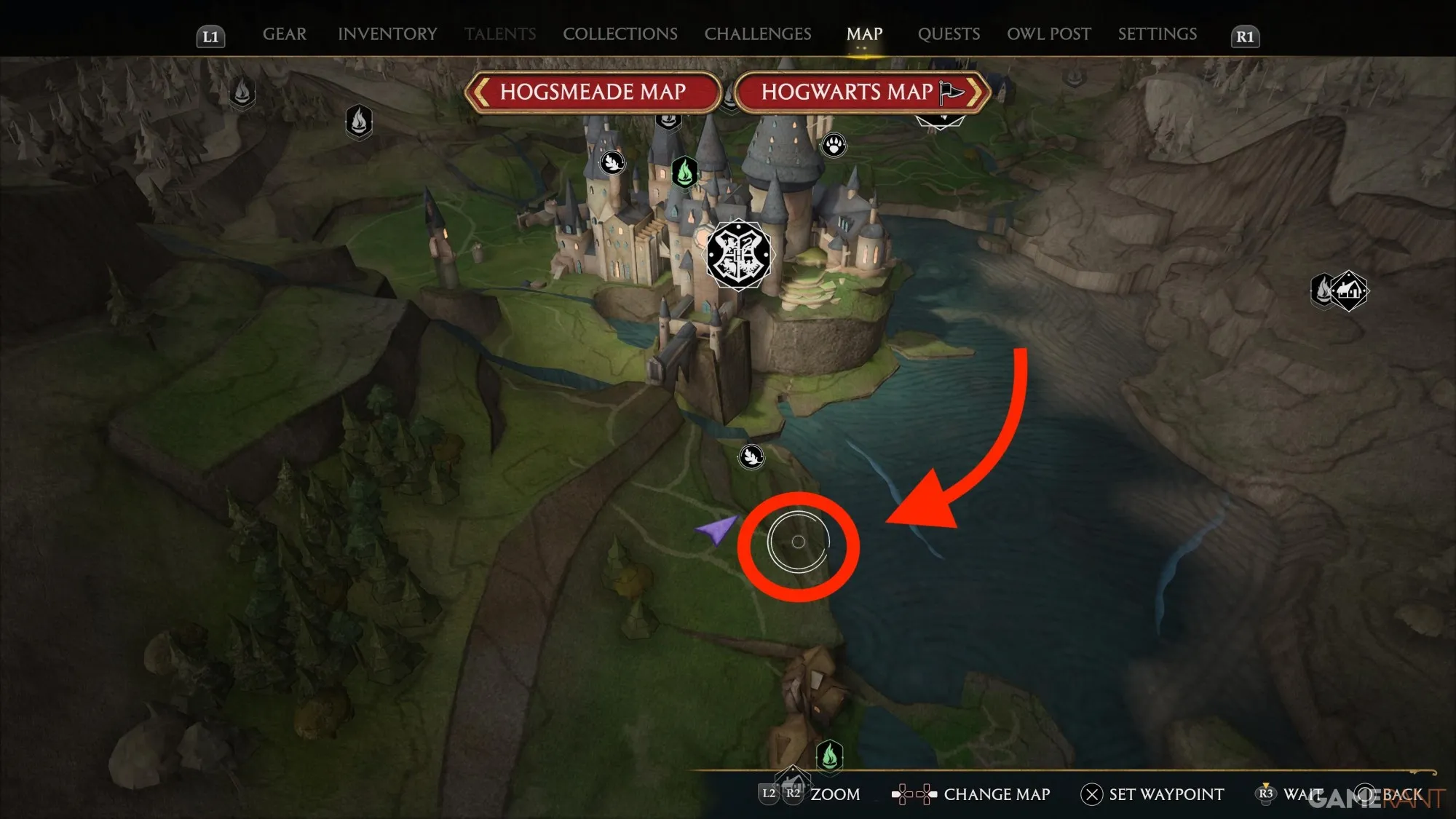 Игроки могут найти это конкретное хранилище сокровищ, следуя по южному пути, ведущему из школы Хогвартс. В конце концов, игроки наткнутся на хижину, о которой мы упоминали ранее и которая показана на карте ниже. Красный круг - это местоположение самого хранилища, а хижина находится всего в нескольких футах к западу от него. Просто спуститесь от хижины к воде, и на карте появится значок хранилища.