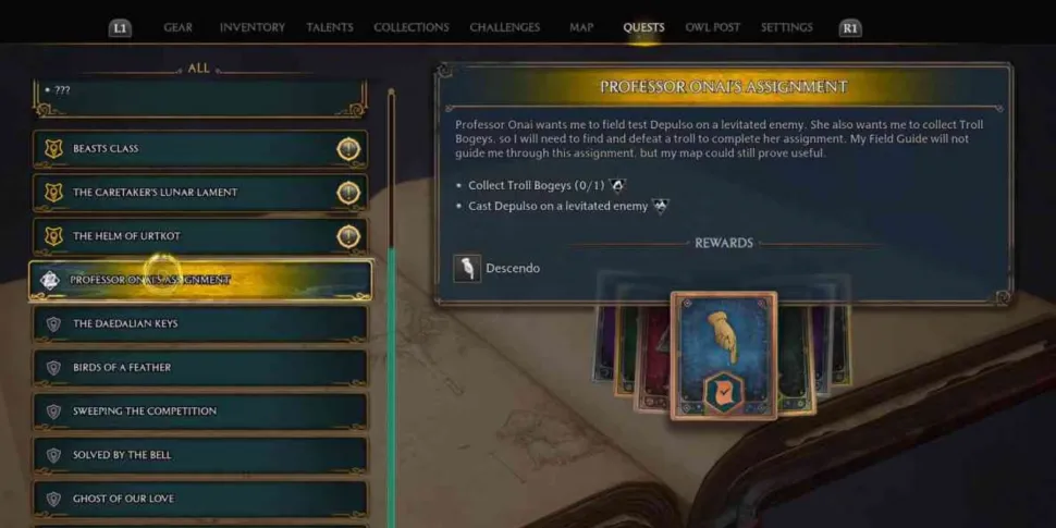 Чтобы разблокировать квест «Задание профессора Онаи», игроки должны сначала пройти испытание Персиваля Рэкхэма. После этого они должны получить от профессора сову, объясняющую некоторые задачи, которые необходимо выполнить, прежде чем она научит их Descendo. В этом случае игроки должны сделать следующее: