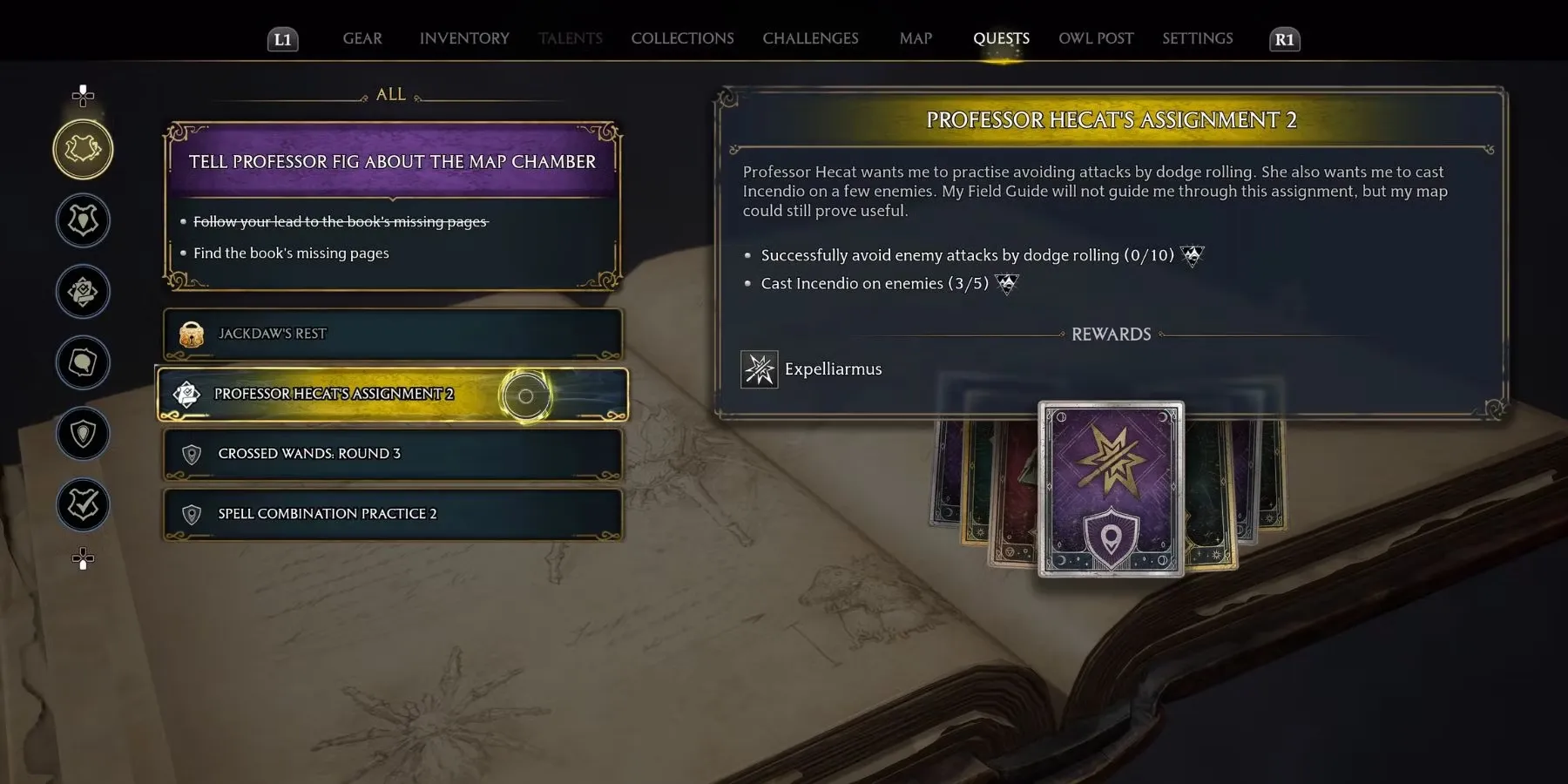 Профессор Гекат хочет, чтобы игрок использовал Incendio на врагов 5 раз и успешно уклонился от 10 атак. Эти задания достаточно просты, и игроки могут выполнить их в одном боевом столкновении с Эшвиндерами, браконьерами или любыми другими группами врагов.