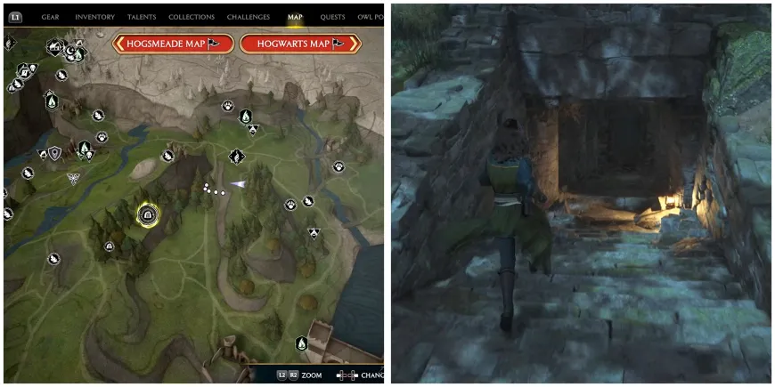 Победите браконьера, охраняющего вход, и откройте дверь, применив Алохомору II. Разберитесь с Инфери внутри и подойдите к стене рядом со входом в комнату, чтобы забрать сокровища.