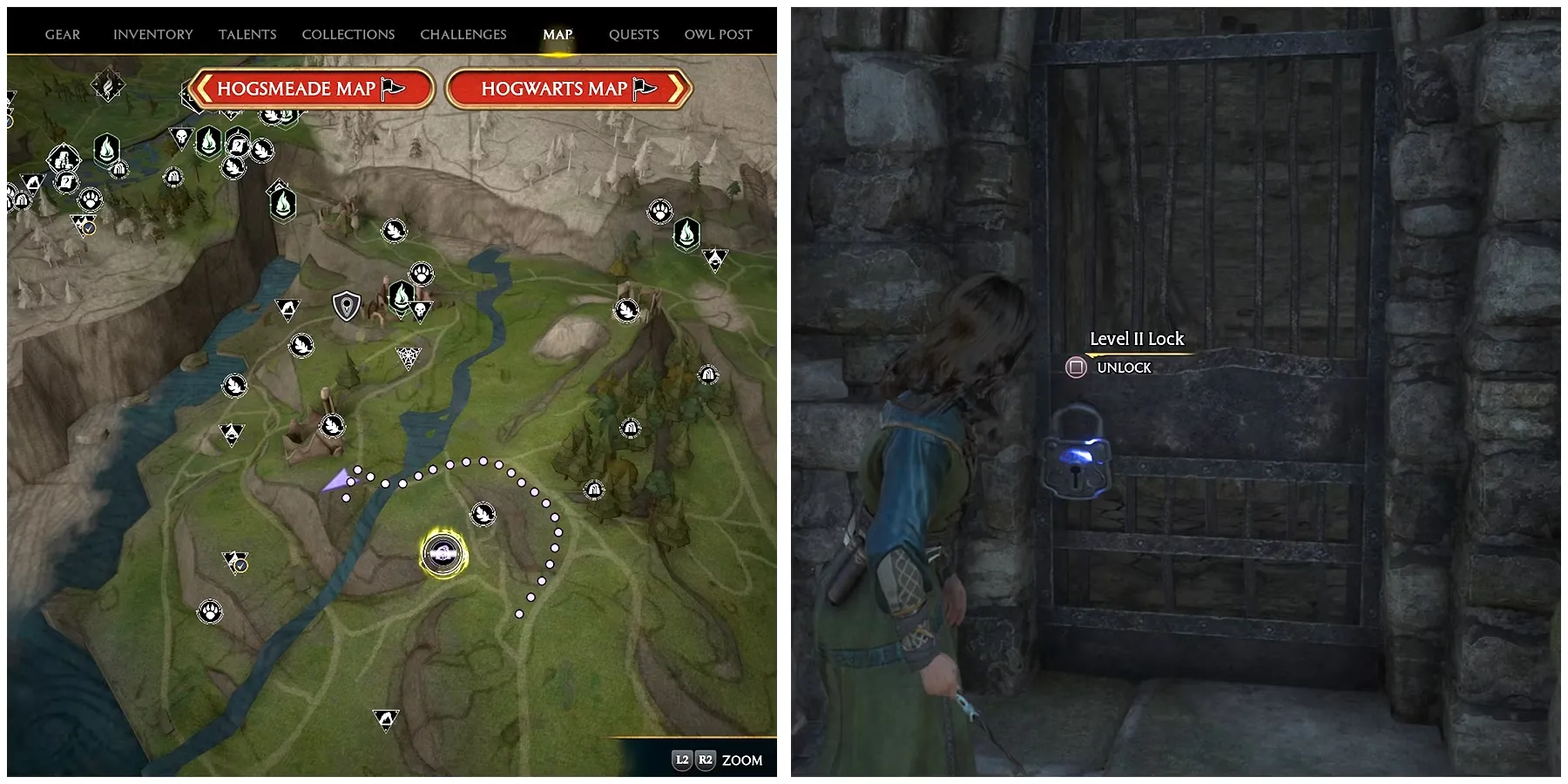 Чтобы открыть его, необходим заколдованный куб. Предмет можно найти на западе, запертым в клетке, которую охраняет группа браконьеров в Hogwarts Legacy. К сожалению, это замок III уровня, поэтому Алохомора III жизненно необходима. Как только герои подведут куб к платформе с помощью Accio или Wingardium Leviosa, произнесите огненное заклинание, чтобы открыть хранилище.